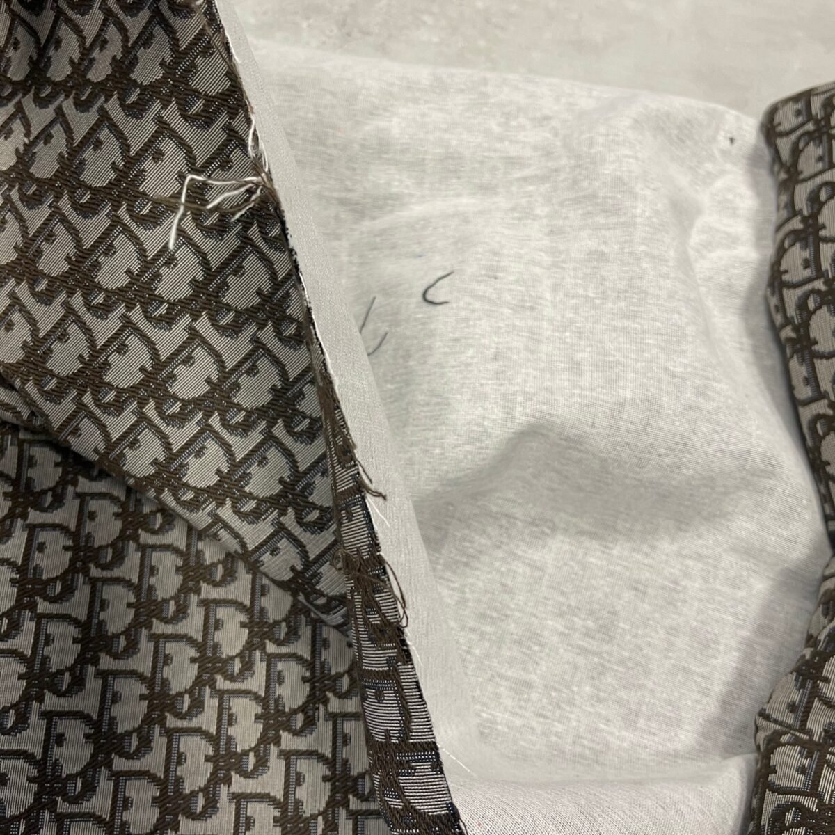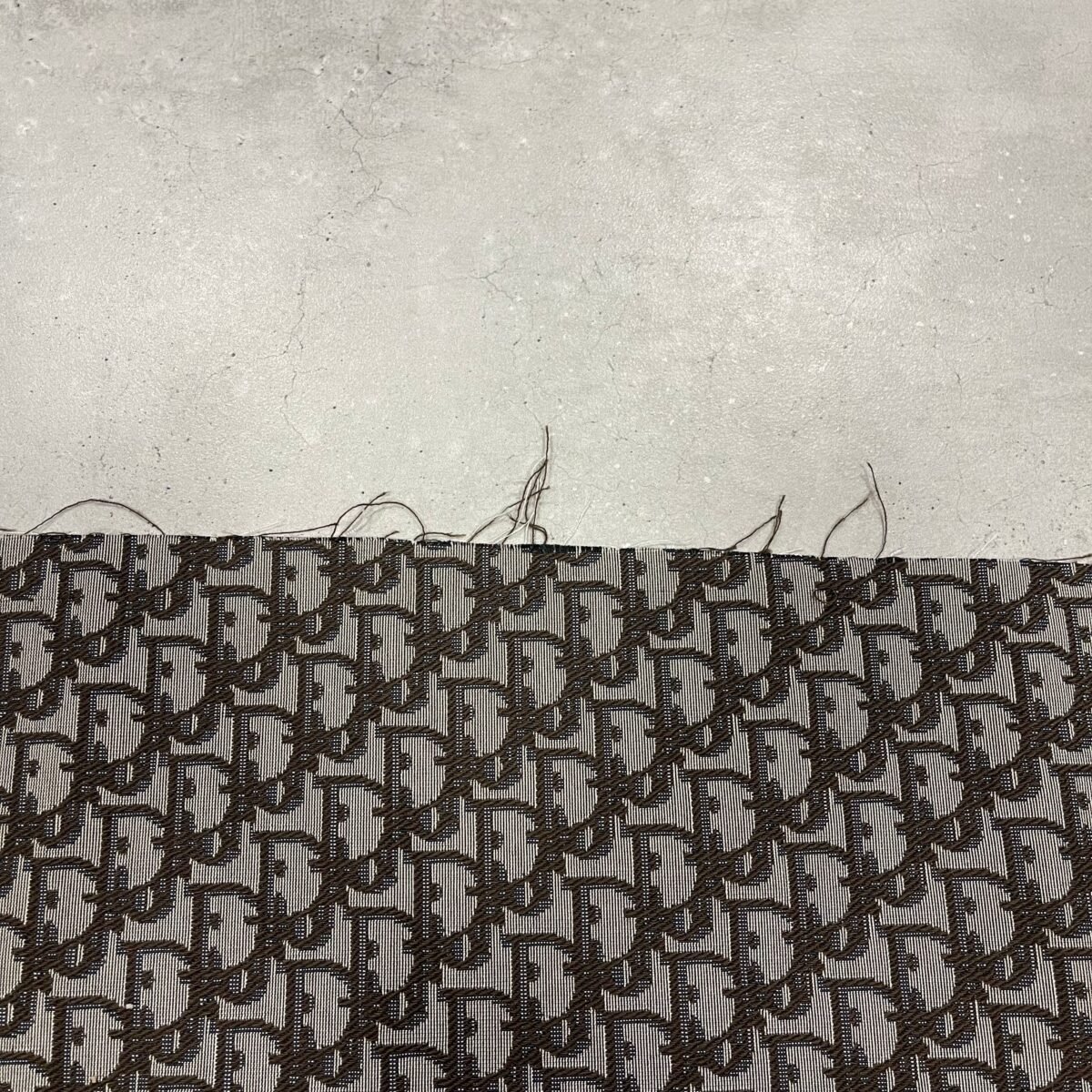 Christian D fabric with a beige background and brown color logo’s.