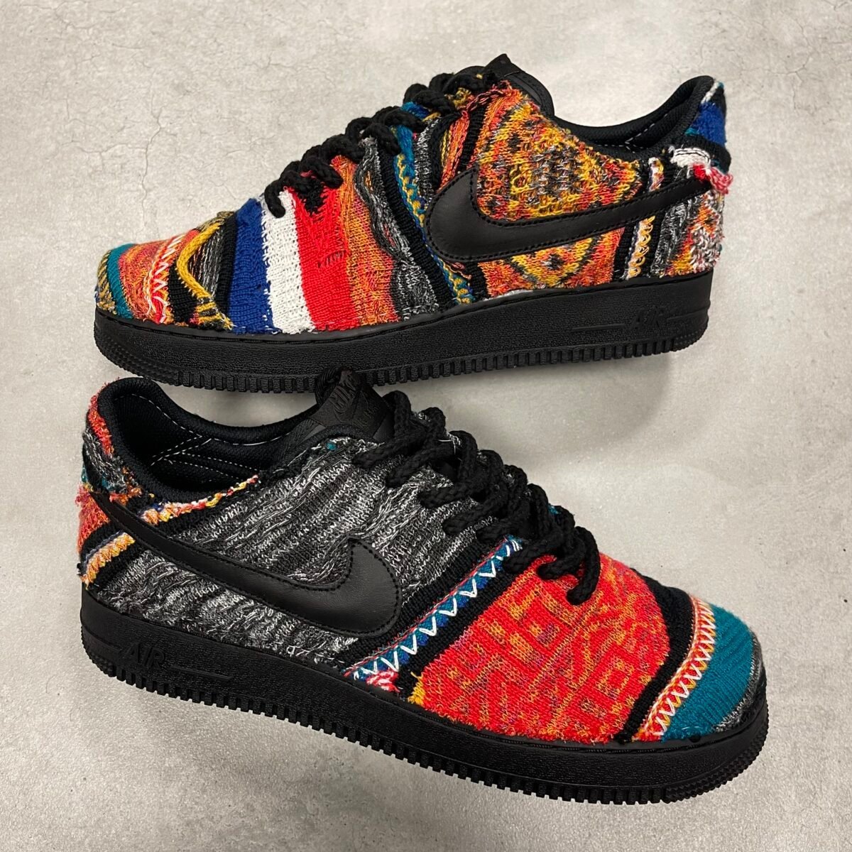 CUSTOM AIR FORCE 1 made out of a carlo colucci sweater. The fabric is glued and sewn on. The swooshes are stitched back on. Small black rope laces added. Only making 1 pair!