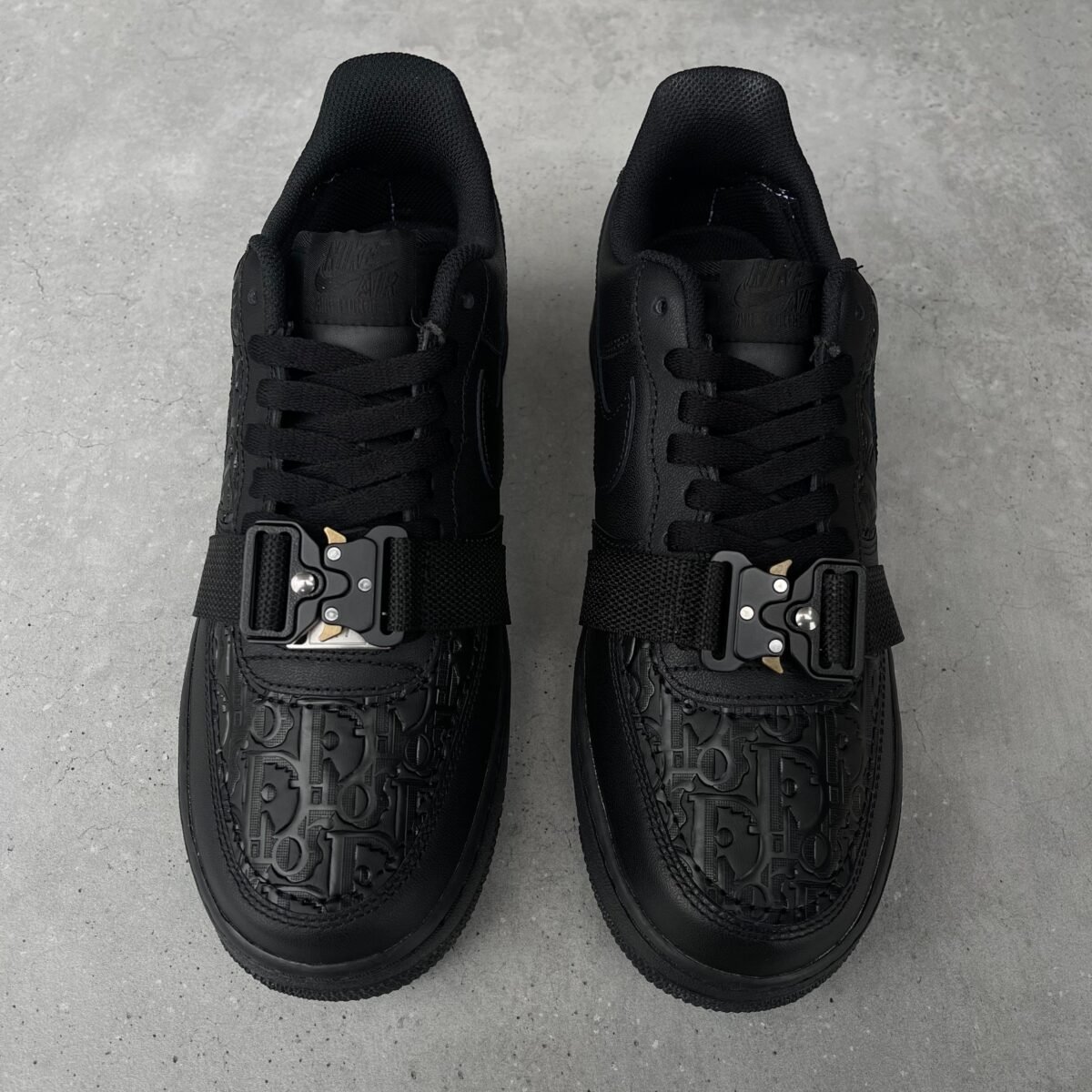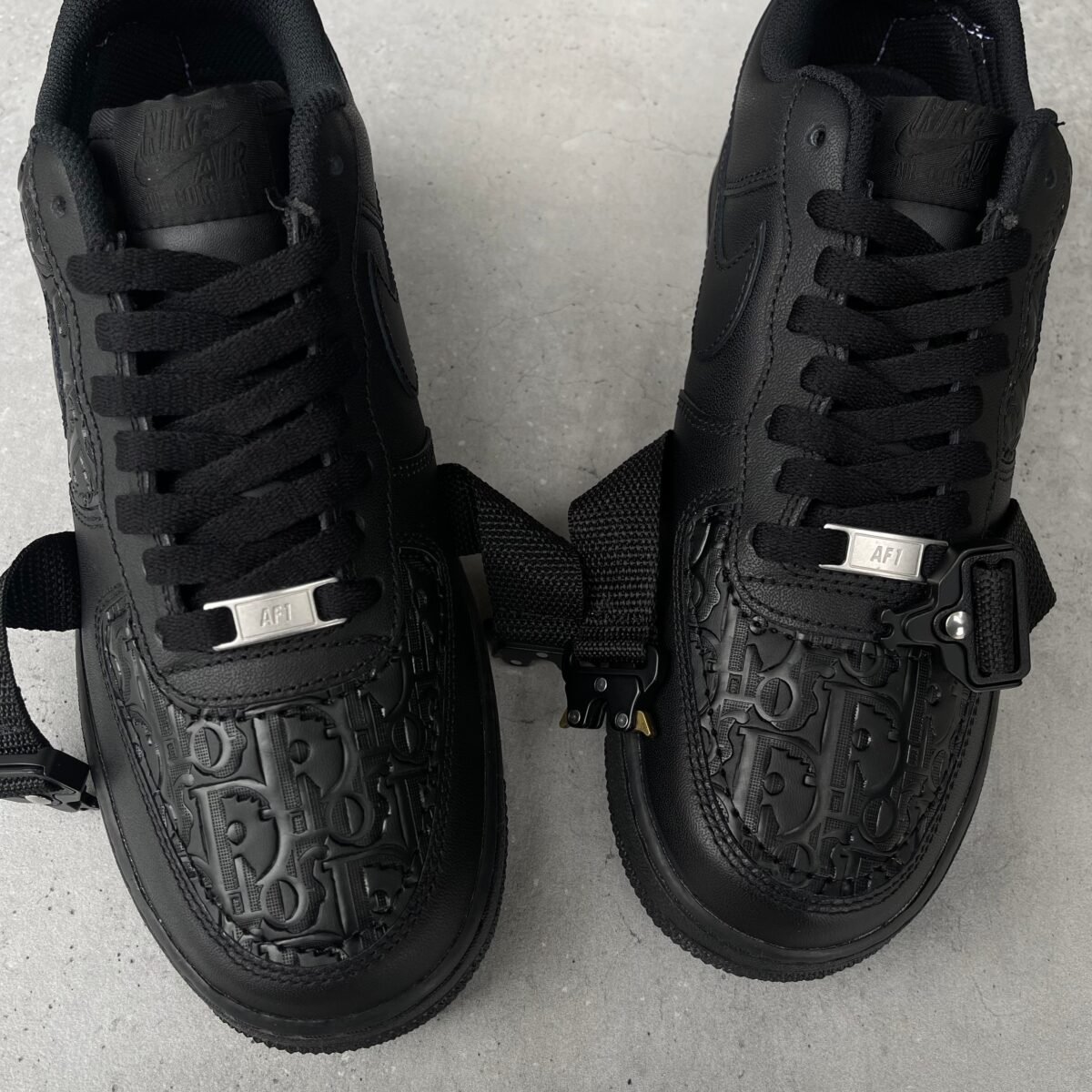 CUSTOM AIR FORCE 1 black with black Christian D embossed leather stitched on the shoe. A belt is also added for decoration (no function)