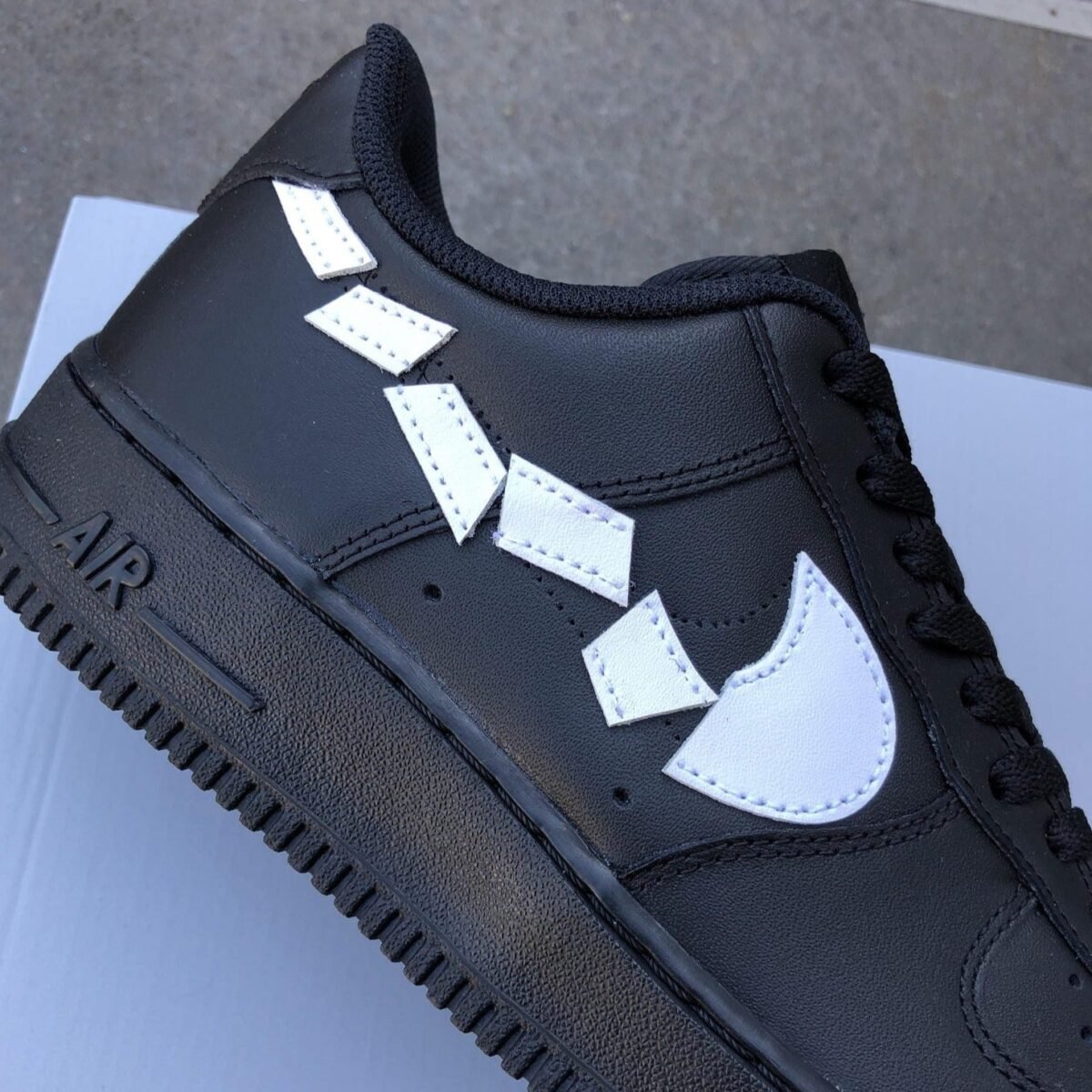 CUSTOM AIR FORCE 1 black destroyed swooshes in white. The swoosh is removed, cut out in pieces and sewn back on.