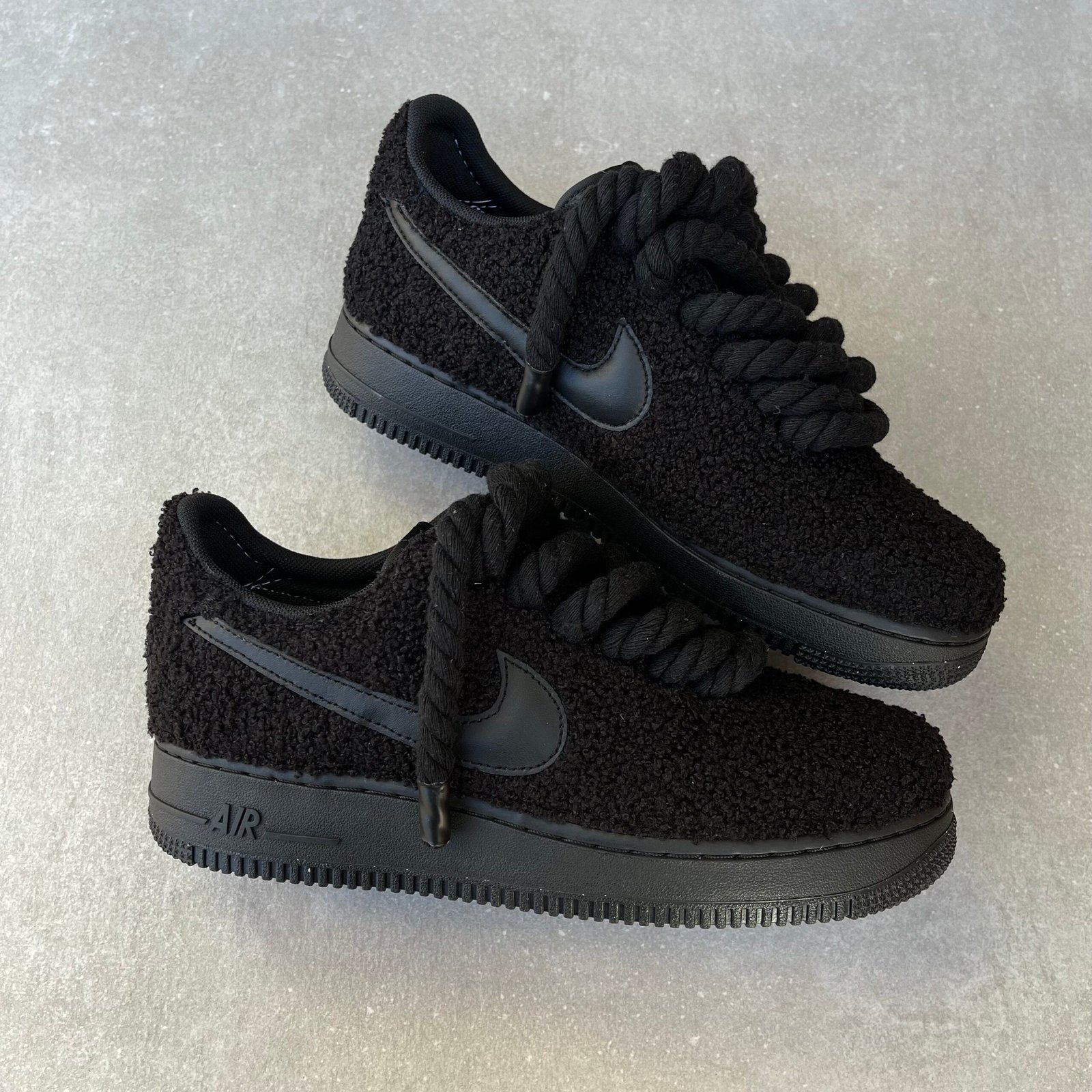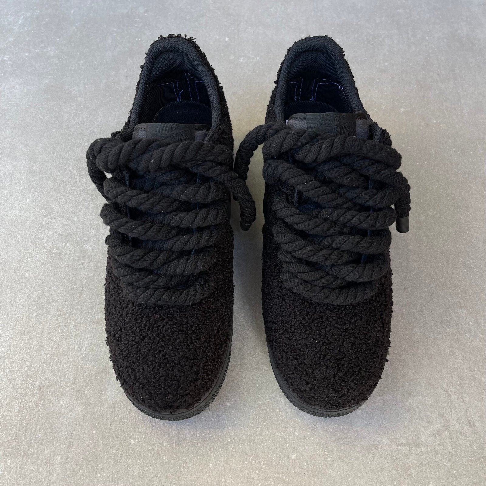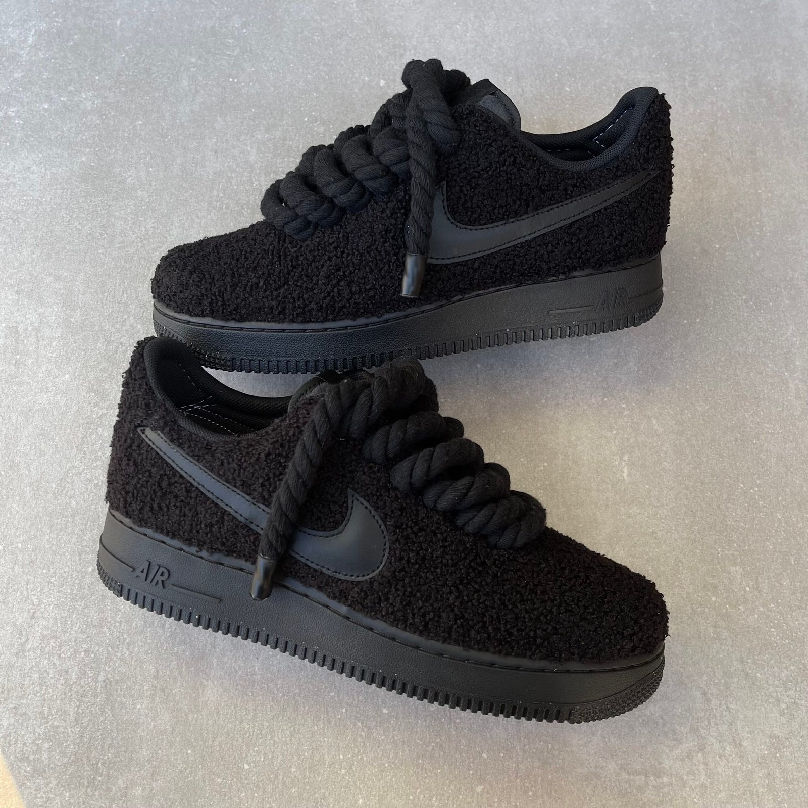 Custom AIR FORCE 1 black covered in full black teddy, glued and stitched. With rope laces.