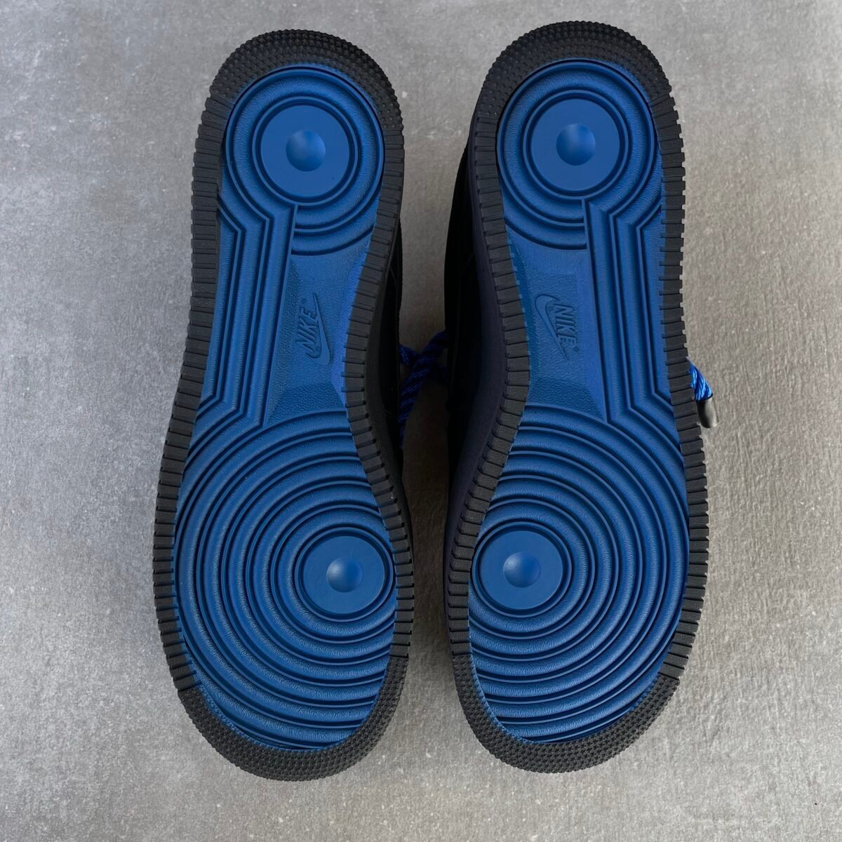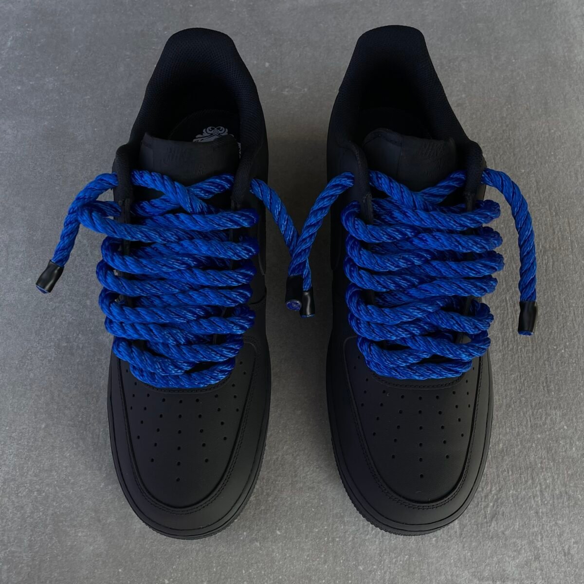 With blue rope laces matching with the blue soles