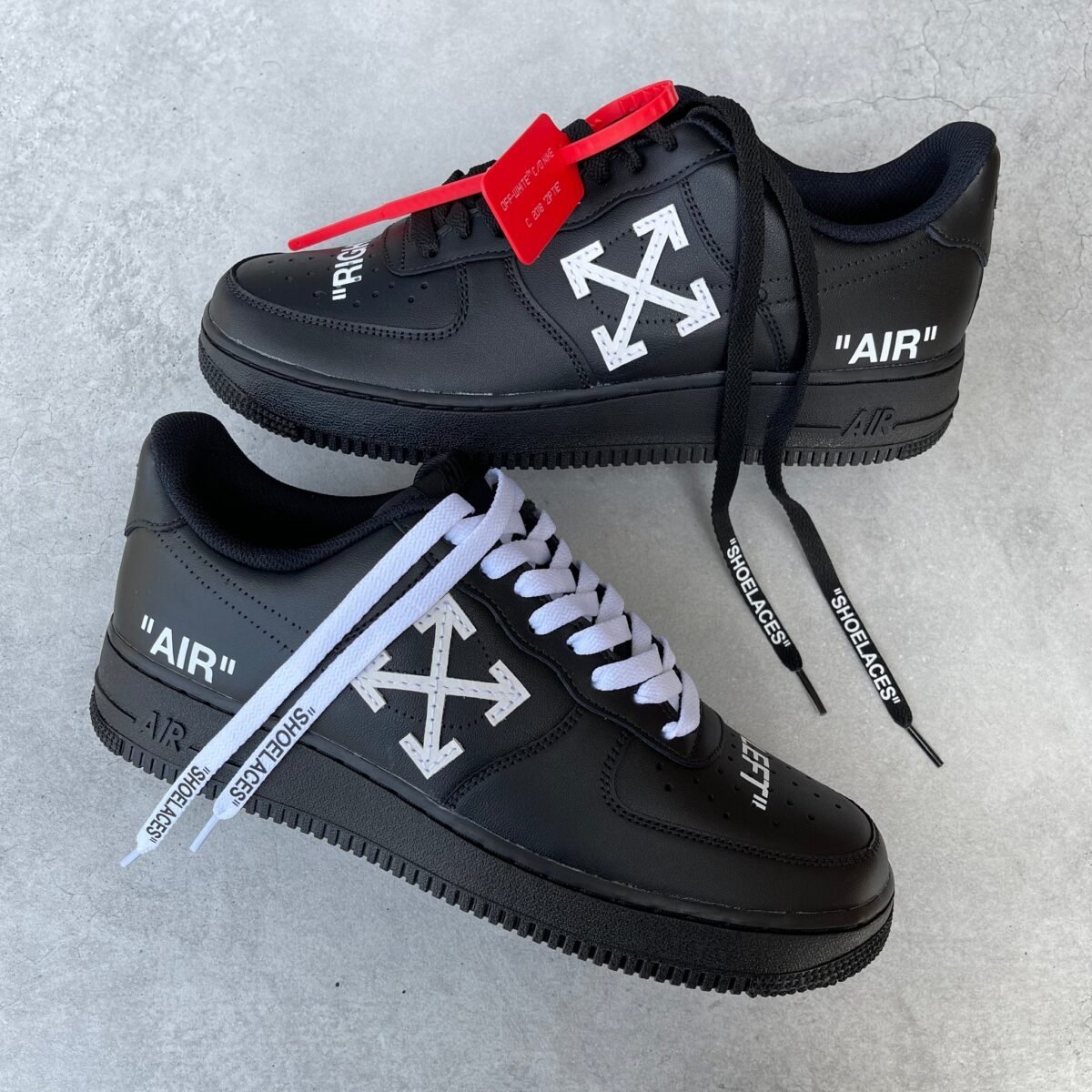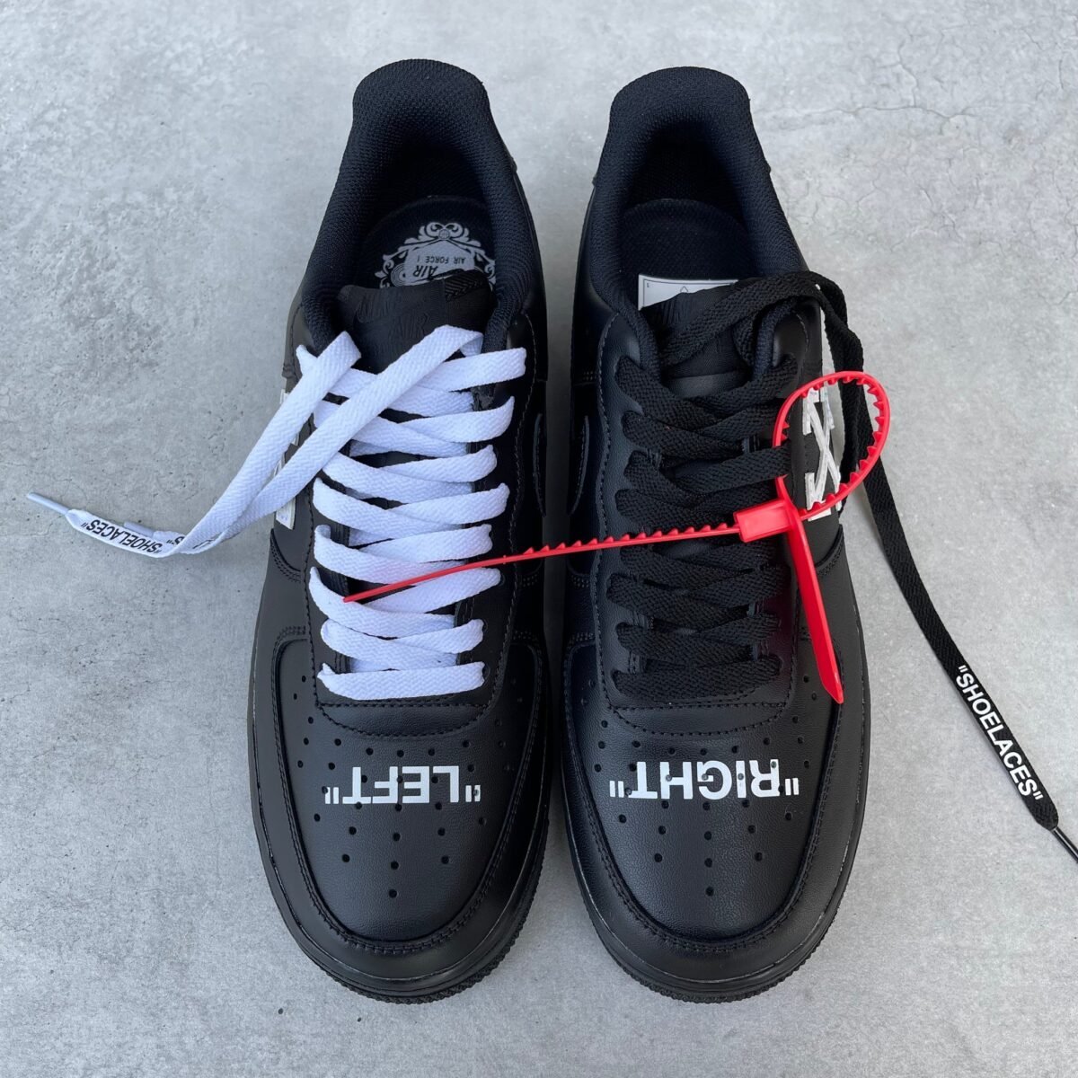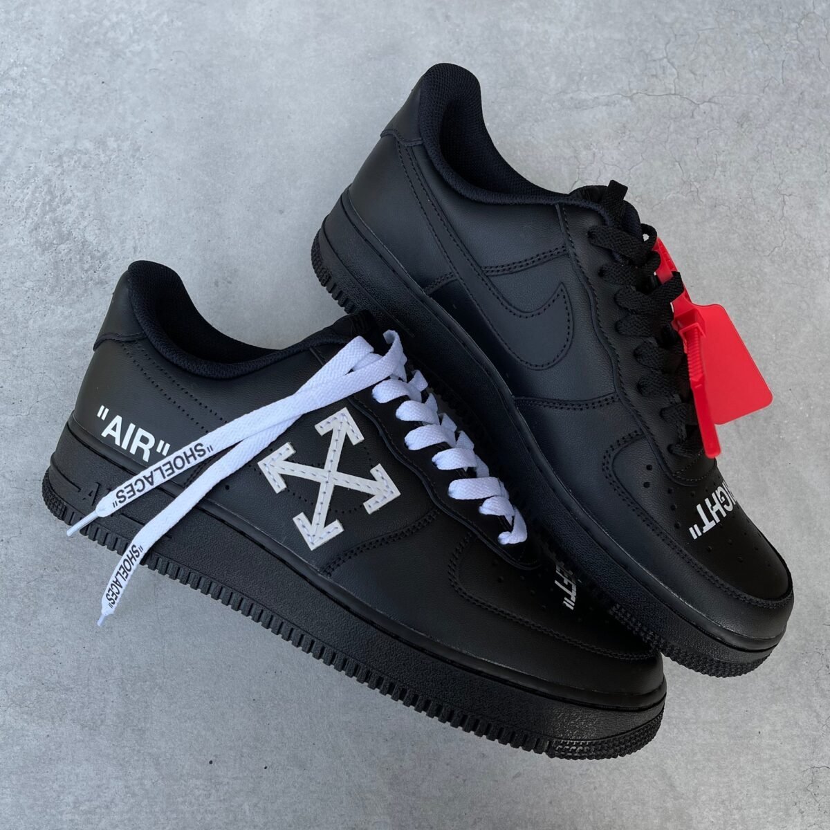 Custom AIR FORCE 1 black OFF WHITE inspired with the OFF WHITE cross and texts. Painted with the best quality paint in the game. Scratch resistant and 100% waterproof. The cross is glued and sewn on.