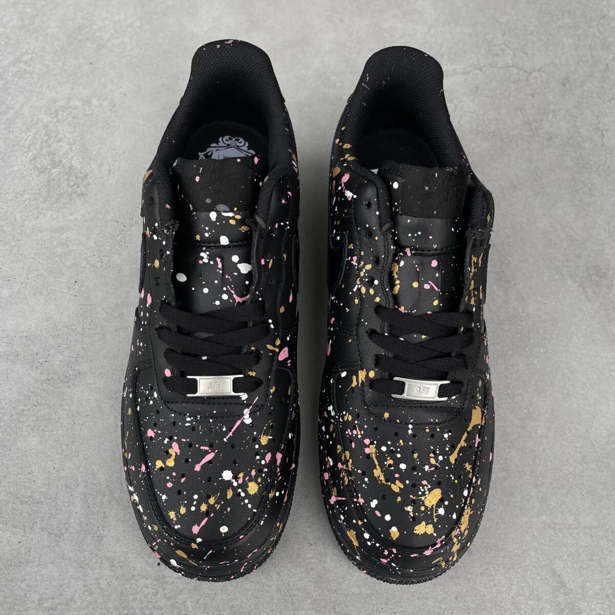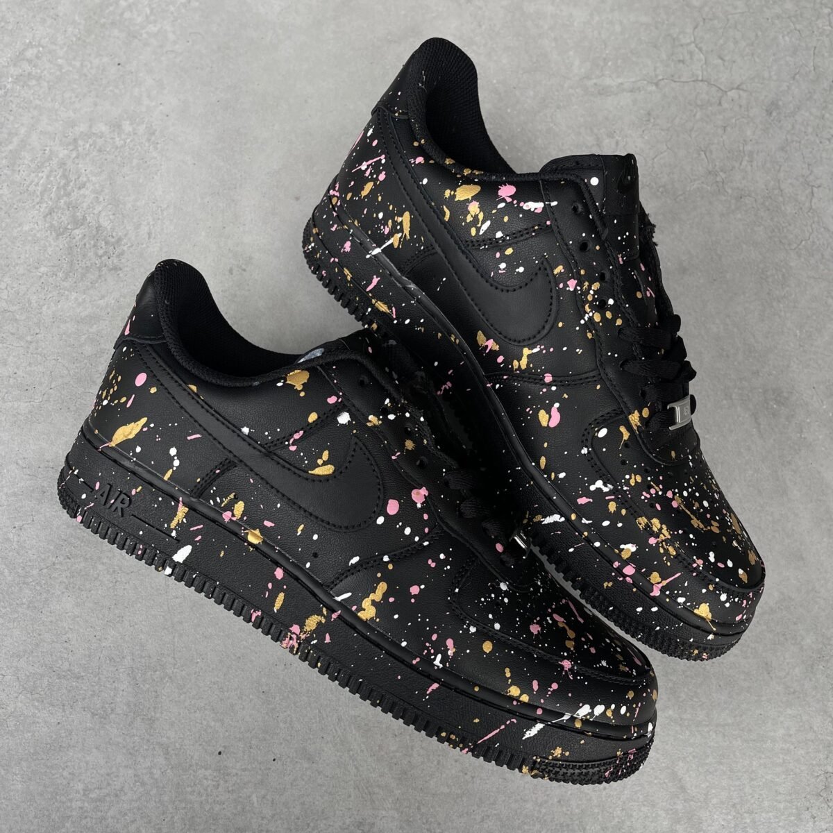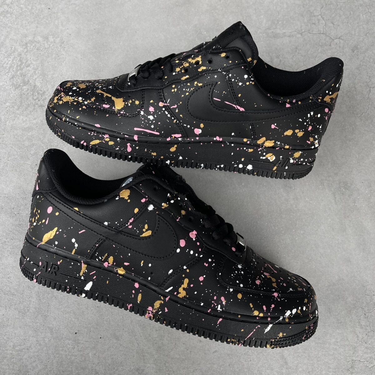 Custom AIR FORCE 1 black with white, gold and rose gold splash all over the shoes except the swoosh. Painted with the best quality paint in the game. Scratch resistant and 100% waterproof.