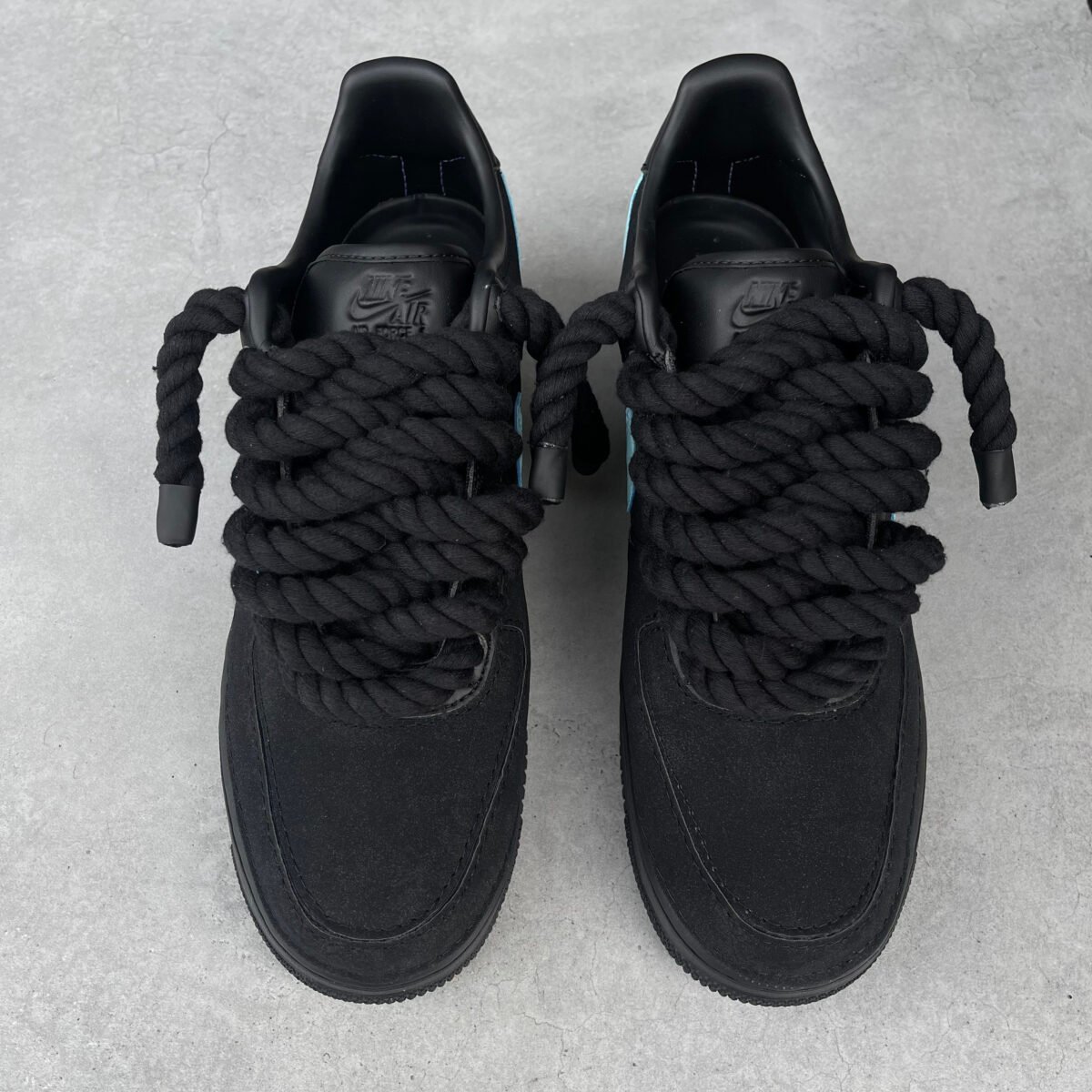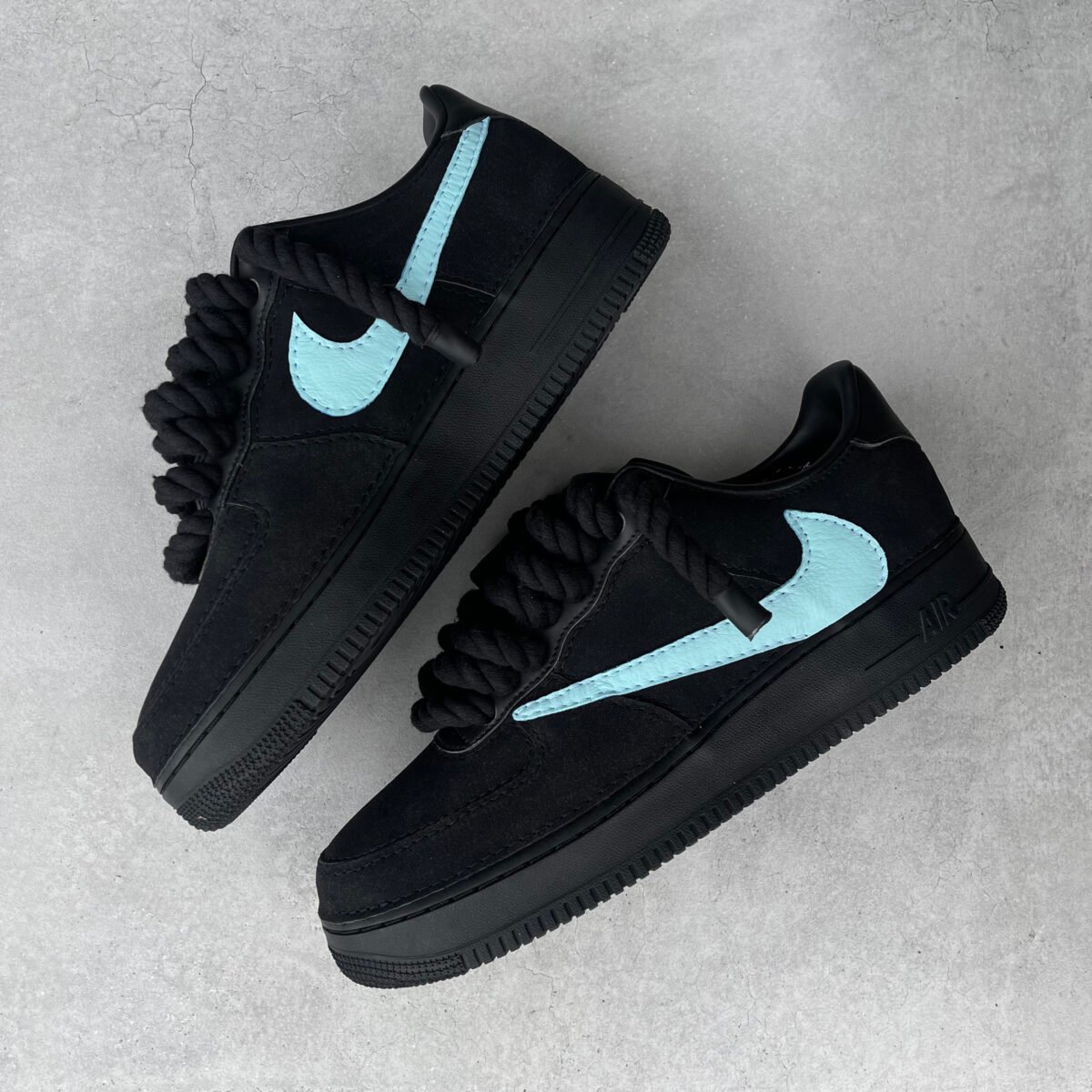 Custom AIR FORCE 1 black – Tiffany inspired Reverse swoosh (rope laces)