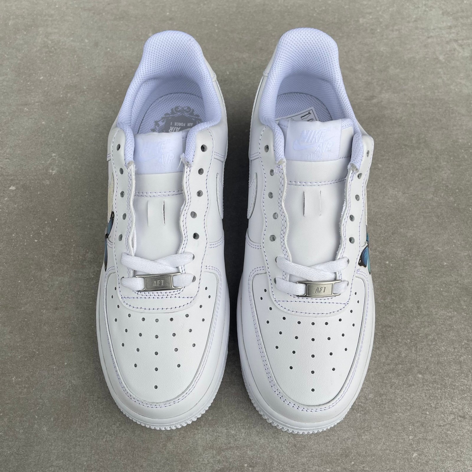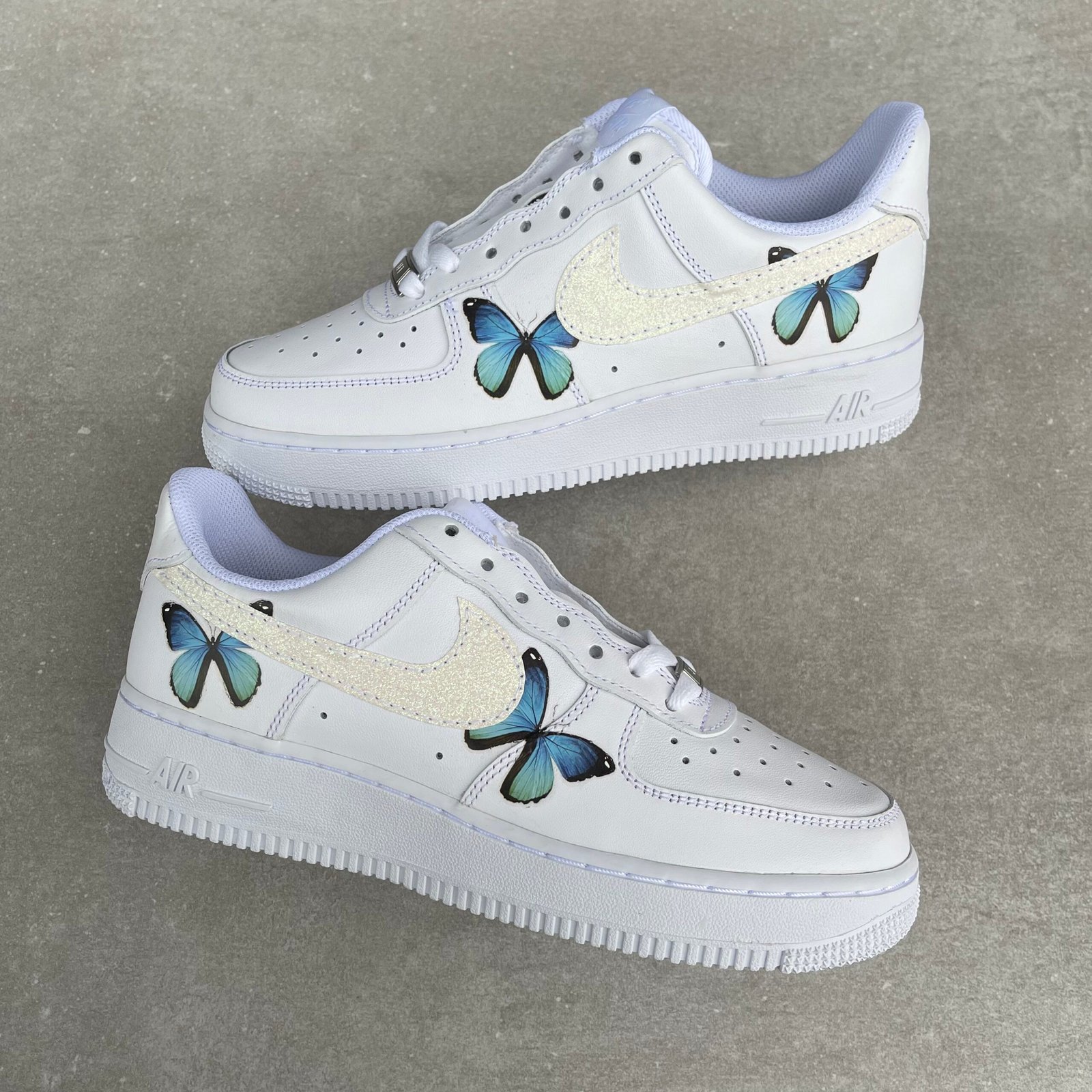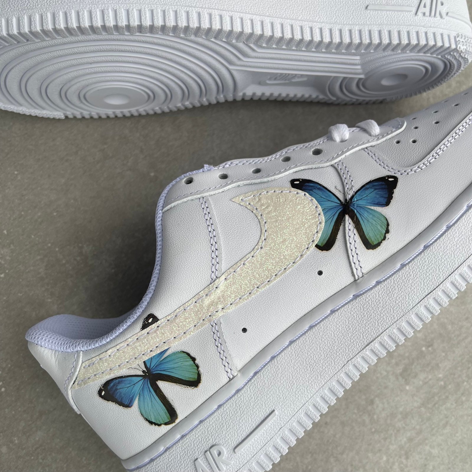 Custom AIR FORCE 1 with blue butterfly’s and glitter swooshes sewn on.