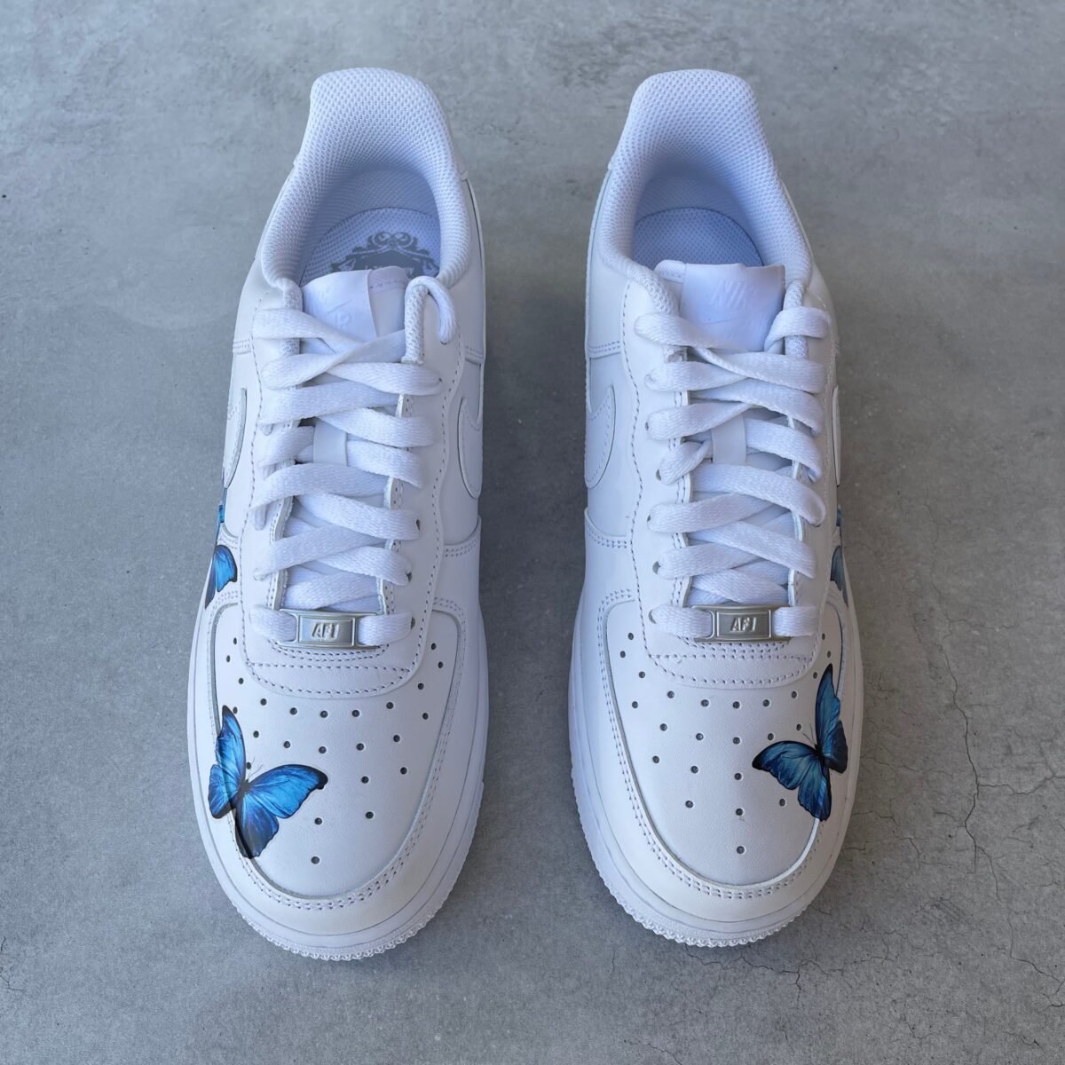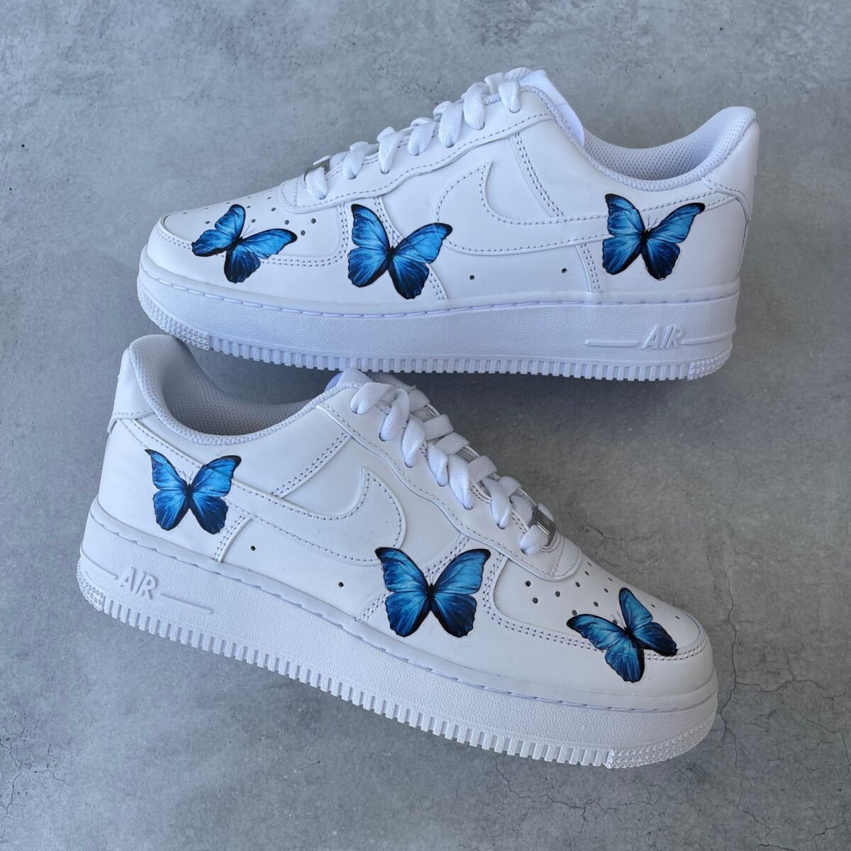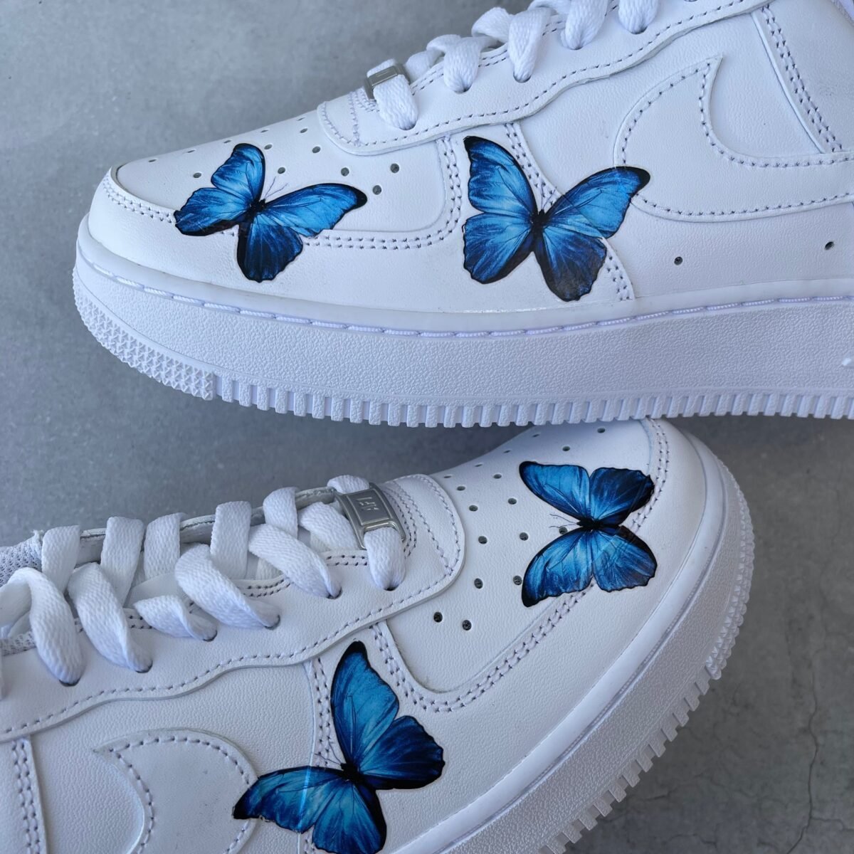 Custom AIR FORCE 1 with blue butterfly’s added. Made with the best quality iron on heat transfers.