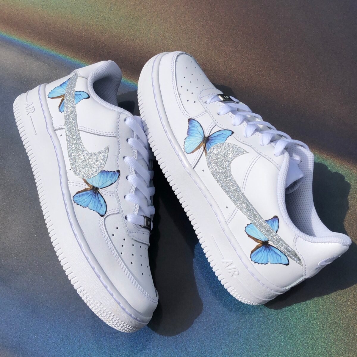 CUSTOM AIR FORCE 1 with blue iron on Butterfly’s around the shoe and a silver glitter swoosh glued and sewn on.