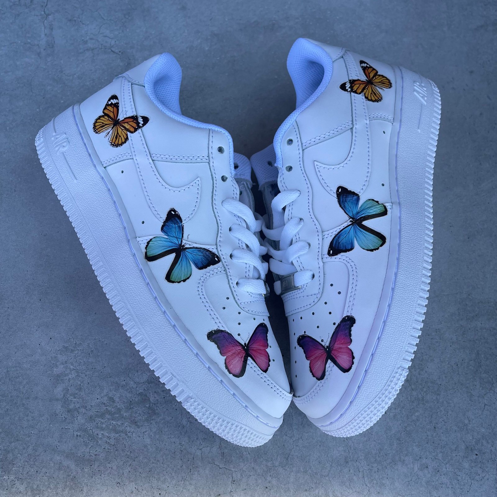 Custom AIR FORCE 1 with blue, pink and orange butterfly’s. Made with the best quality iron on heat transfers.