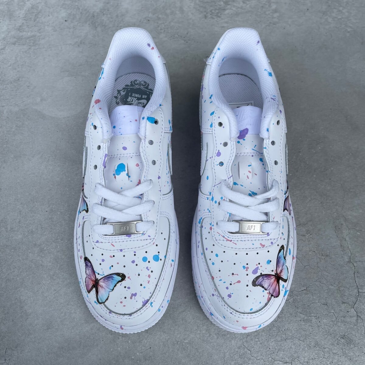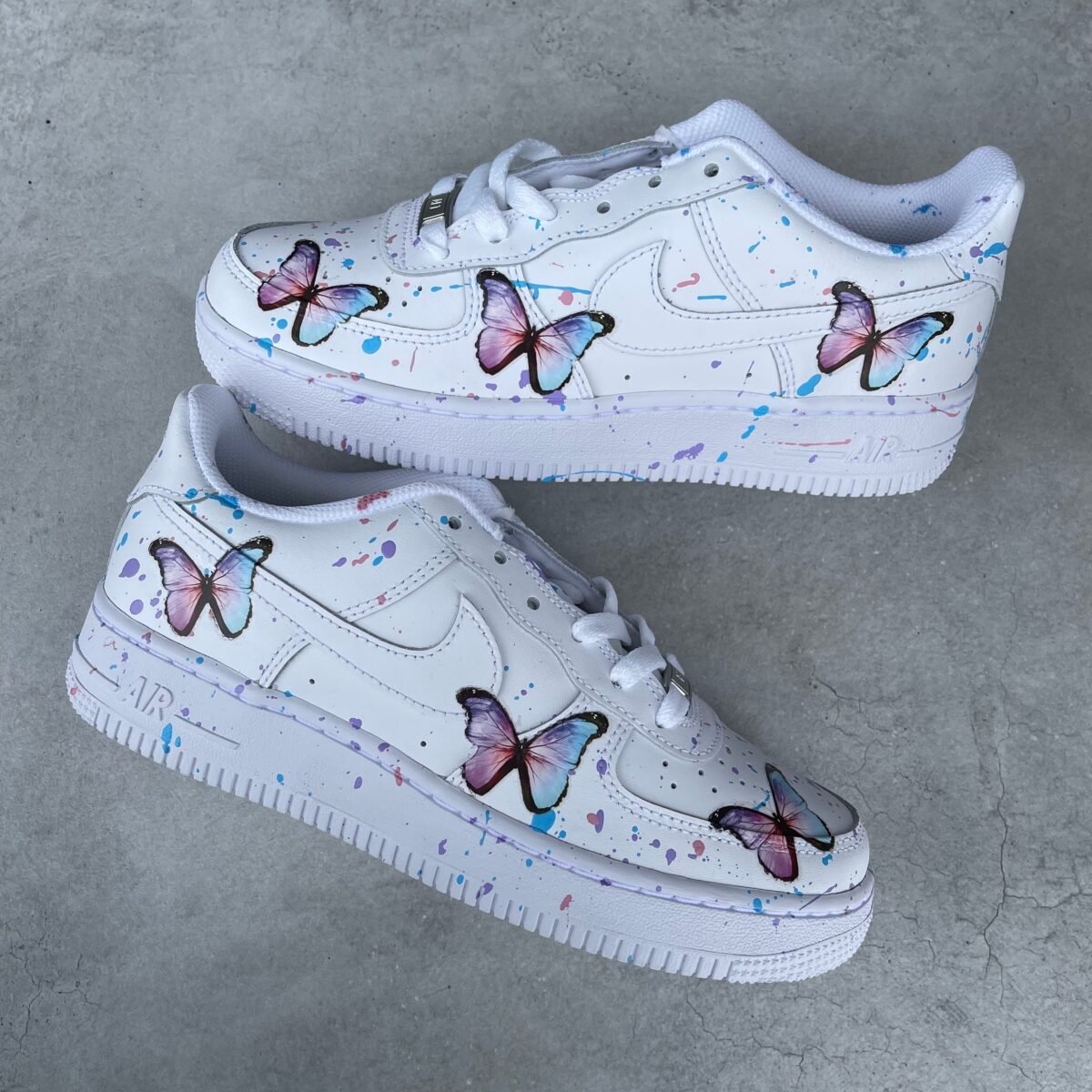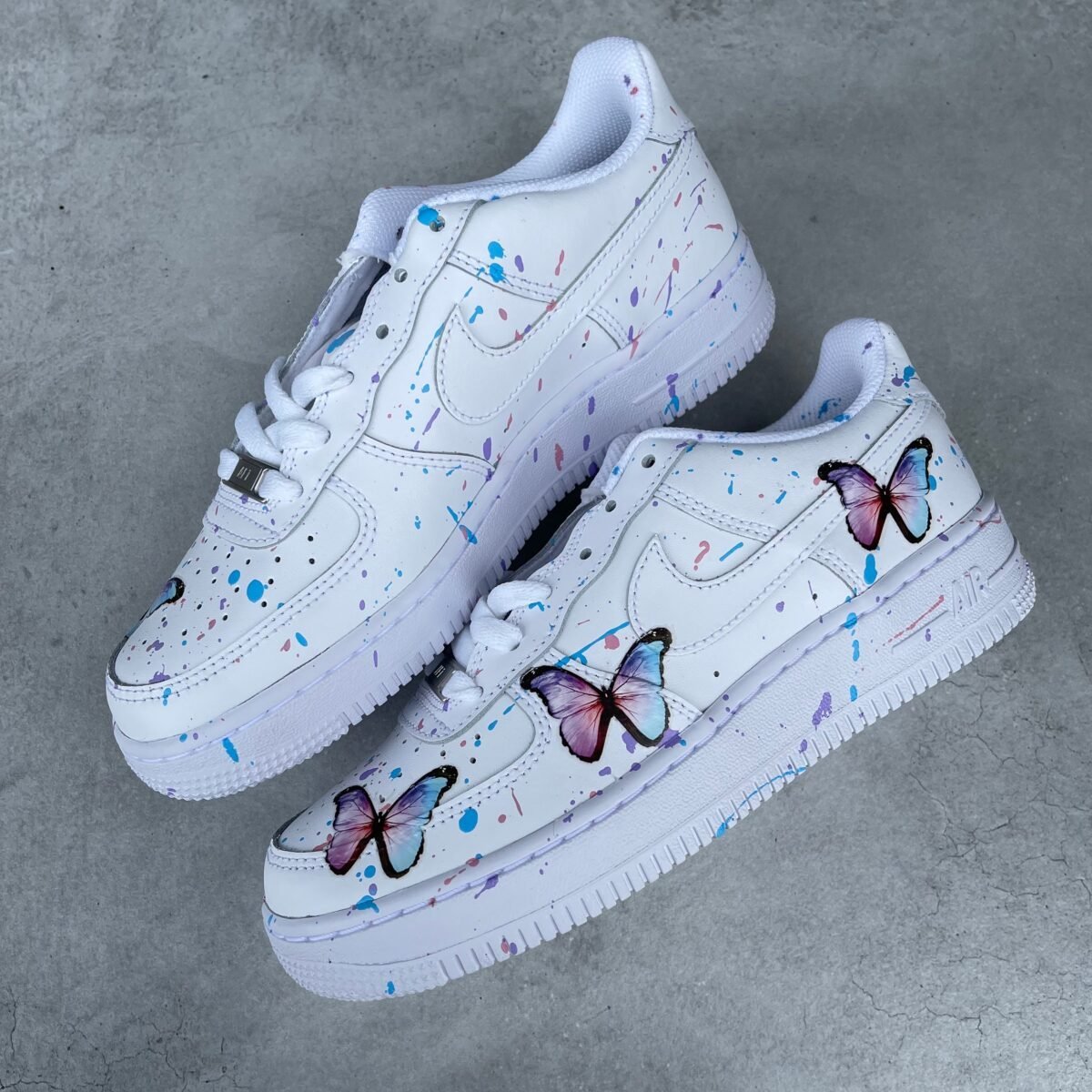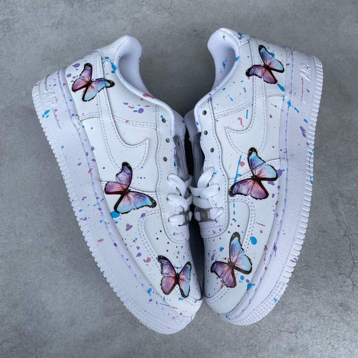 CUSTOM AIR FORCE 1 with blue/pink and purple splash all over except for the swoosh. With butterfly’s added over the shoe. Painted with the best quality paint in the game. Scratch resistant and 100% waterproof. For the butterfly’s we used the best iron on heat transfers.