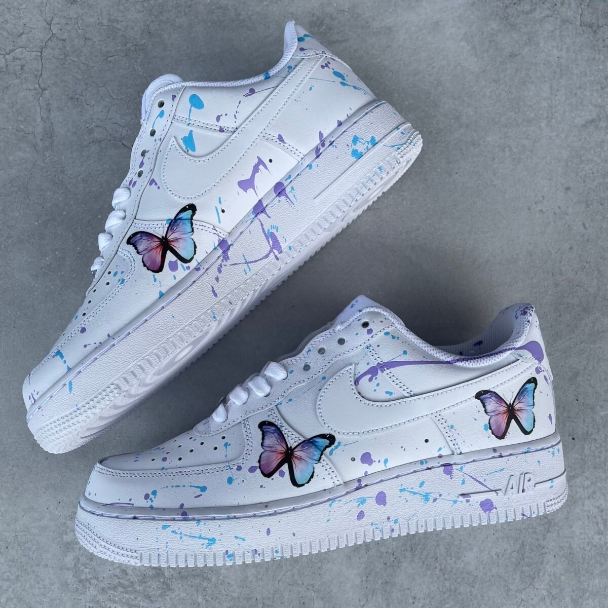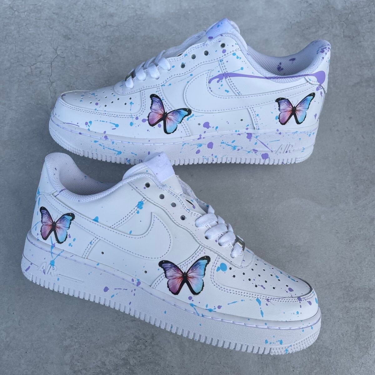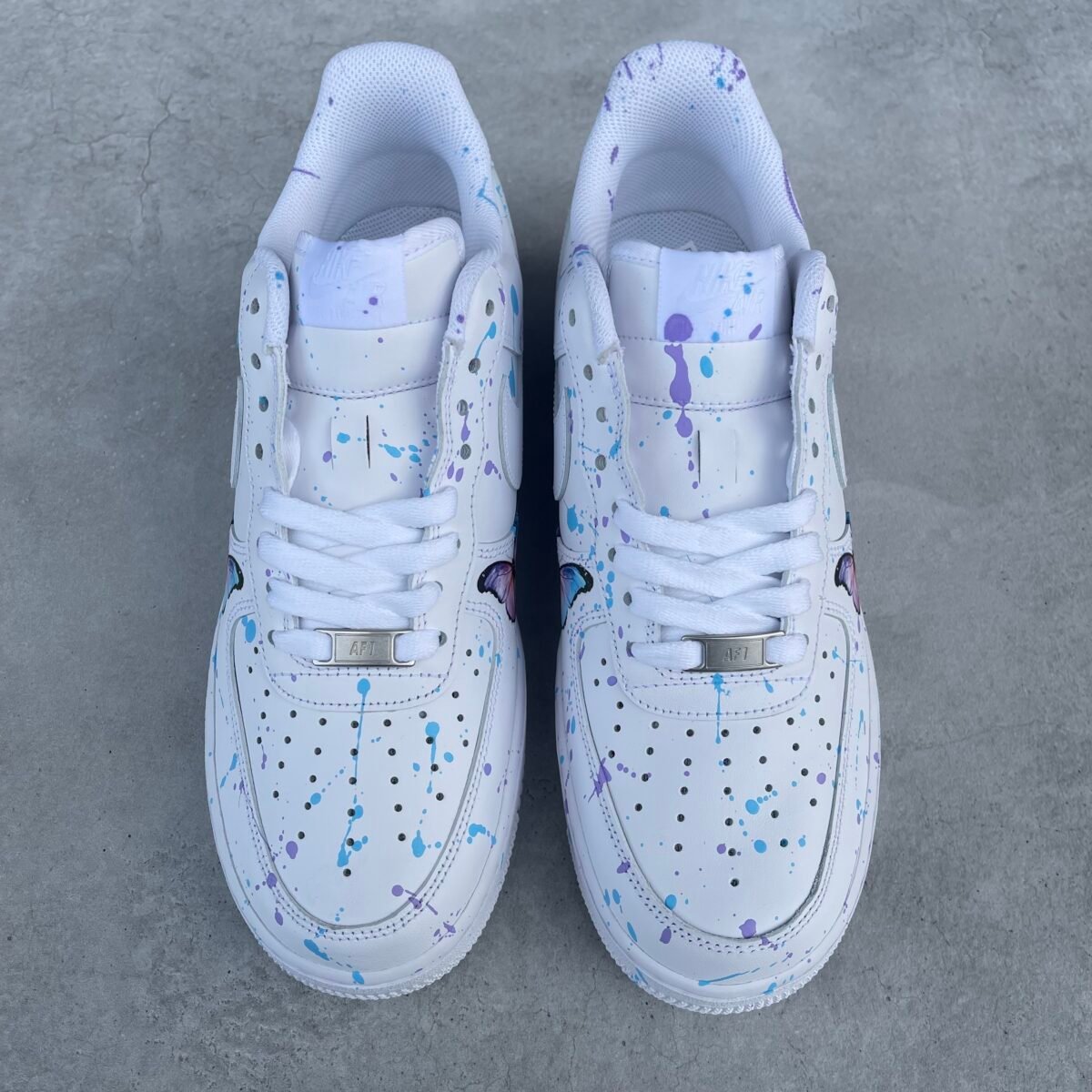 Custom AIR FORCE 1 with blue and purple splash and butterfly’s around the shoe. Painted with the best quality paint in the game. Scratch resistant and 100% waterproof. For the butterfly’s we used the best iron on heat transfers.
