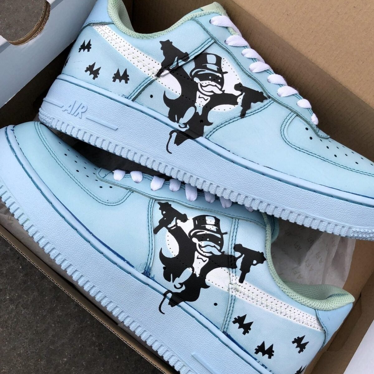 Custom AIR FORCE 1 dipped in blue pigment with the Money man cartoon.