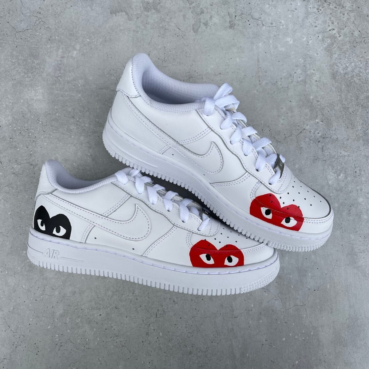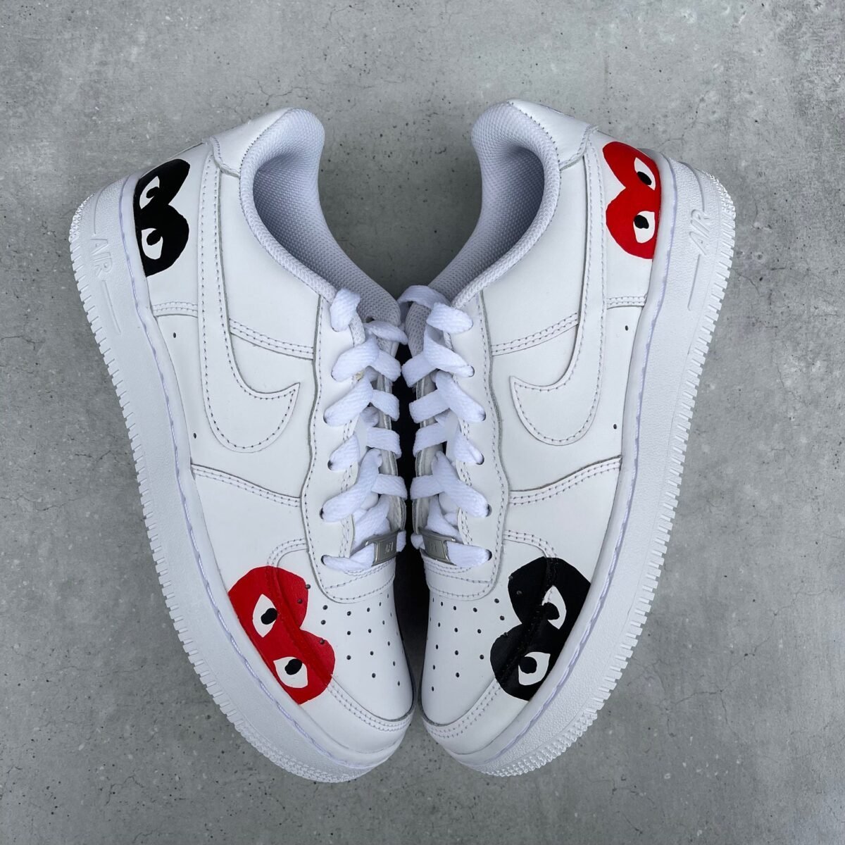 Custom AIR FORCE 1 with multi CDG hearts painted on the outsides of the shoe. The lines around the swoosh are also painted.