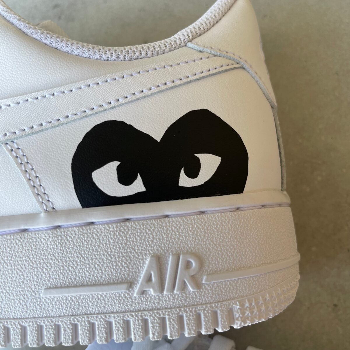 Custom AIR FORCE 1 with the black CDG hearts painted on the outsides of the shoe. Painted with the best quality paint in the game. Scratch resistant and 100% waterproof.