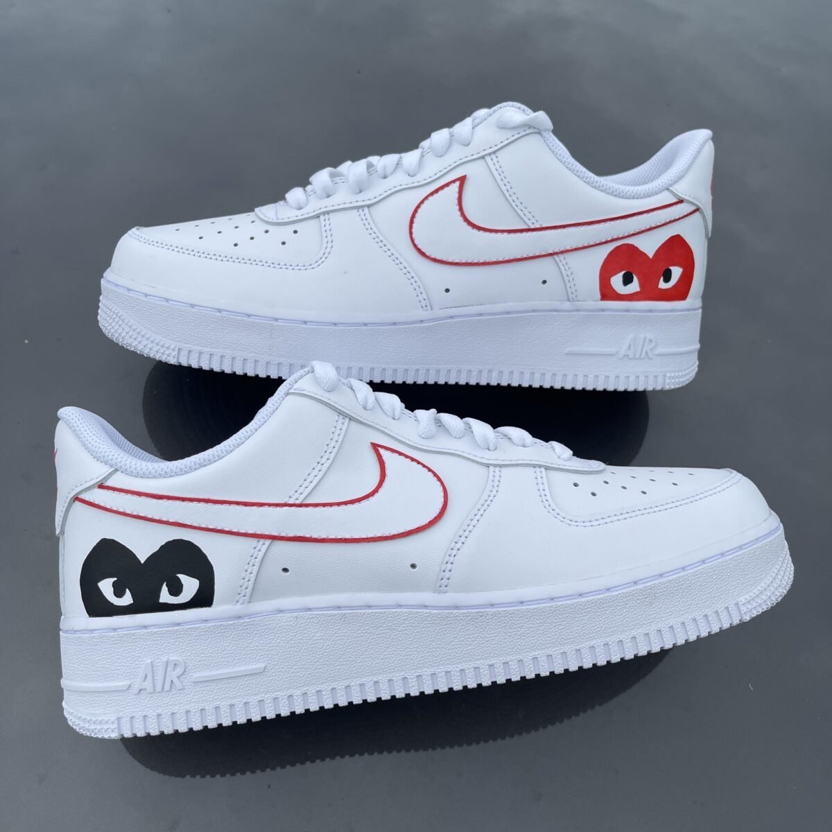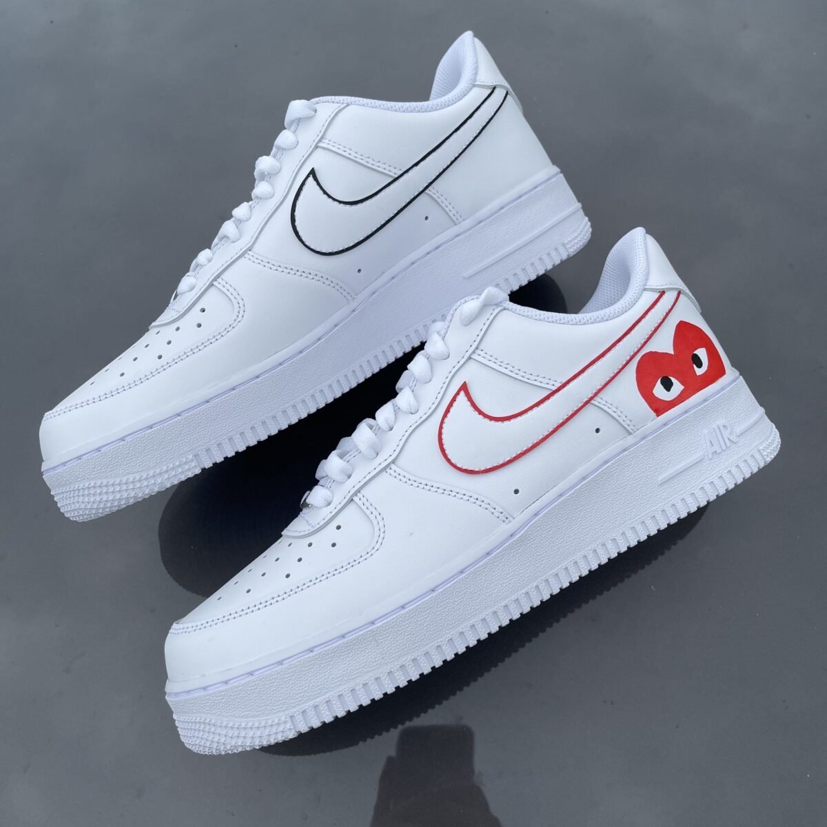 Custom AIR FORCE 1 with a black and red CDG heart painted on the outsides of the shoe. The lines around the swoosh are also painted.