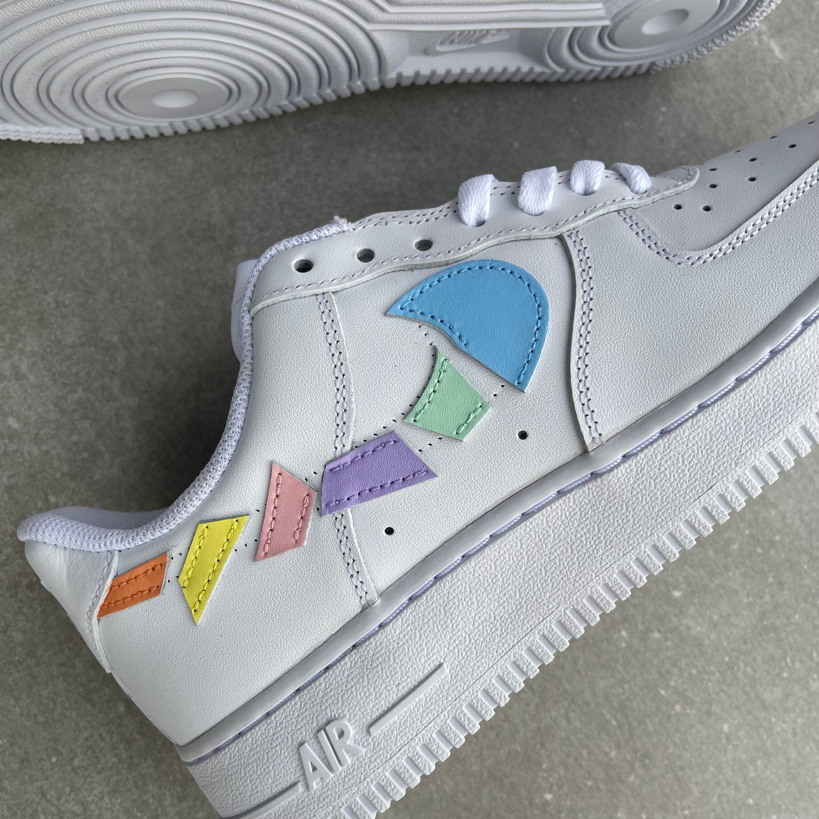 CUSTOM AIR FORCE 1 destroyed swooshes in pastel colors.