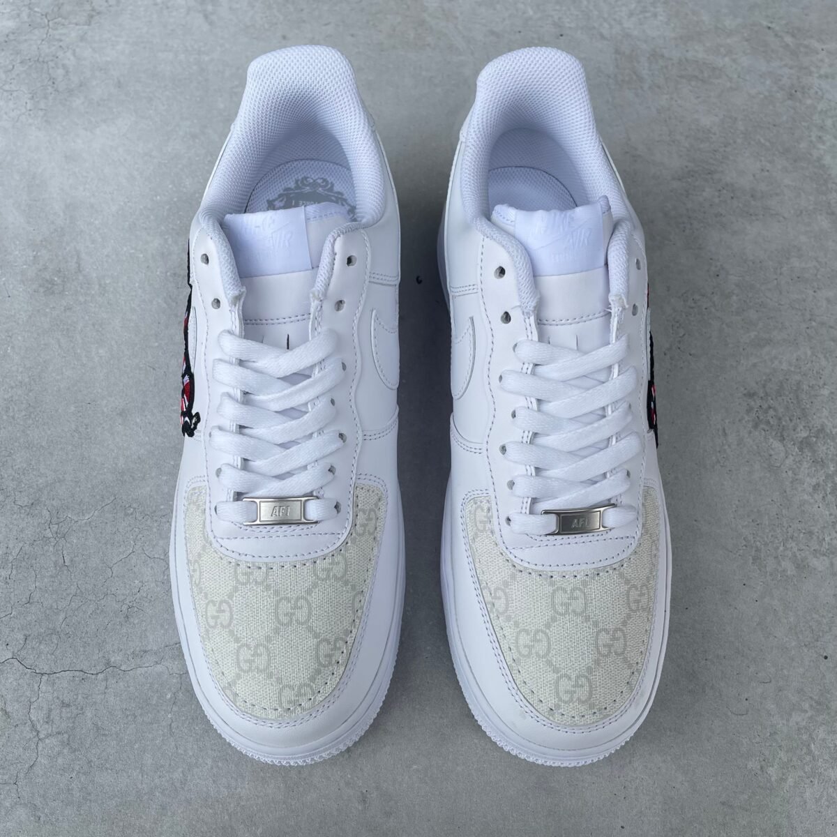 CUSTOM AIR FORCE 1 white with the white double G leather sewn on the toe box and the snakes sewn on both outsides.