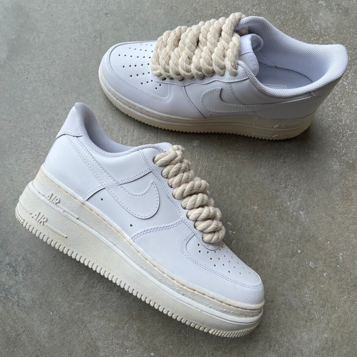 Custom AIR FORCE 1 with a double sole attached. The soles have a vintage effect. Also with the rope laces in a cream / beige color.