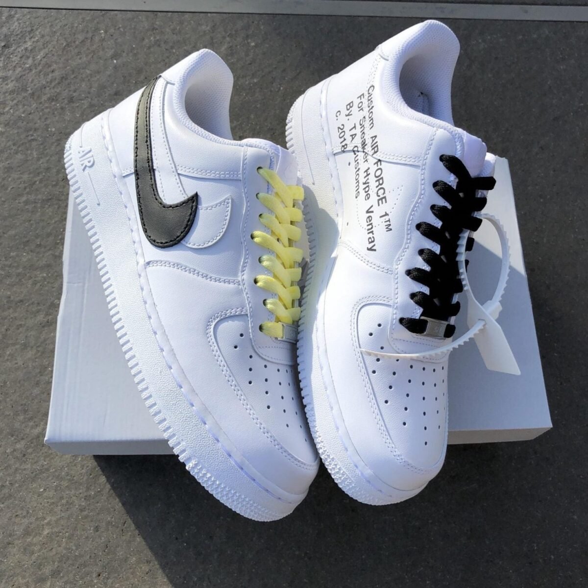 CUSTOM AIR FORCE 1, with the double swooshes in white and black. The swoosh sewn on. The text on the inside is a customized text painted on.