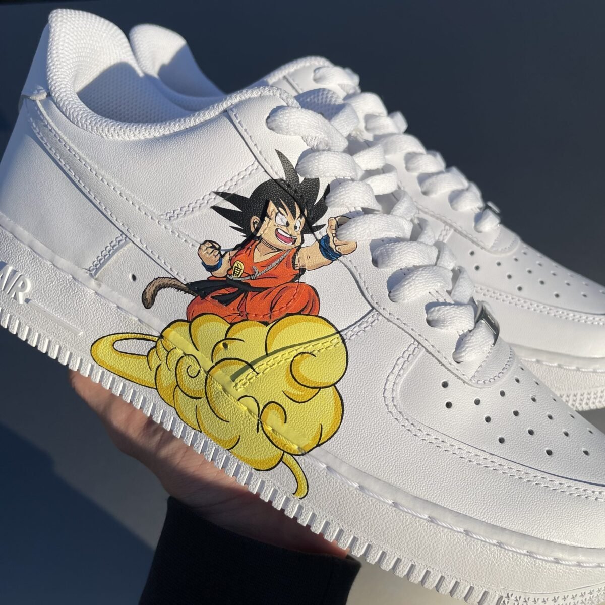 Custom AIR FORCE 1 painted in a Dragon Ball style with Kid Goku on a cloud. Painted with the best quality paint in the game. Scratch resistant and 100% waterproof
