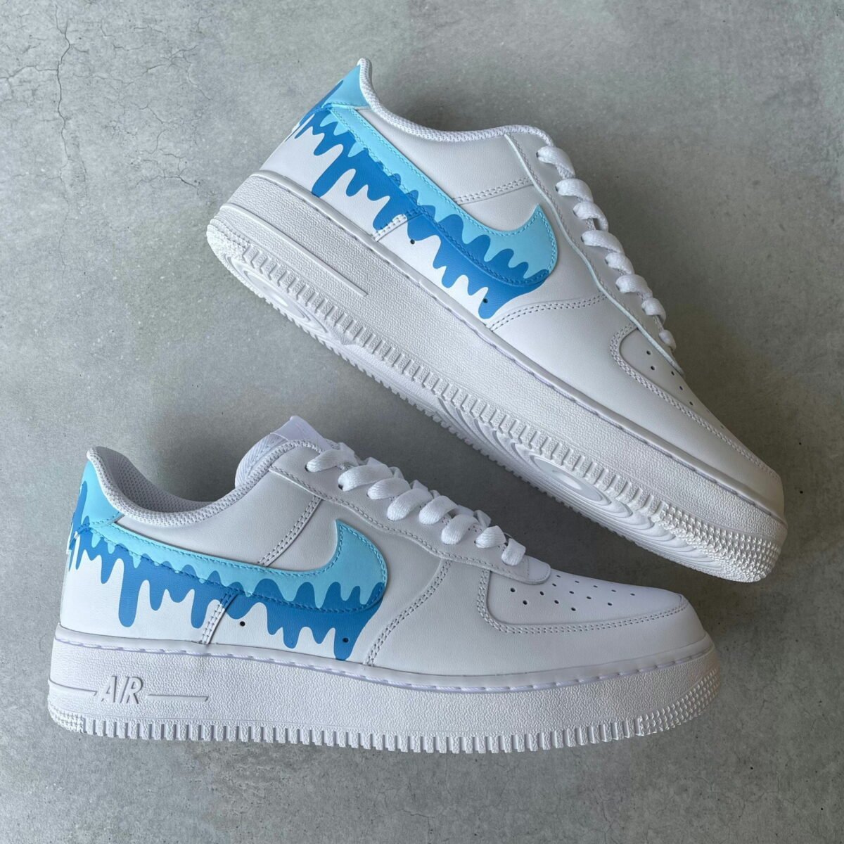 Custom AIR FORCE 1 with the double blue drip all around the swoosh and the back. Painted with the best quality paint in the game. Scratch resistant and 100% waterproof.