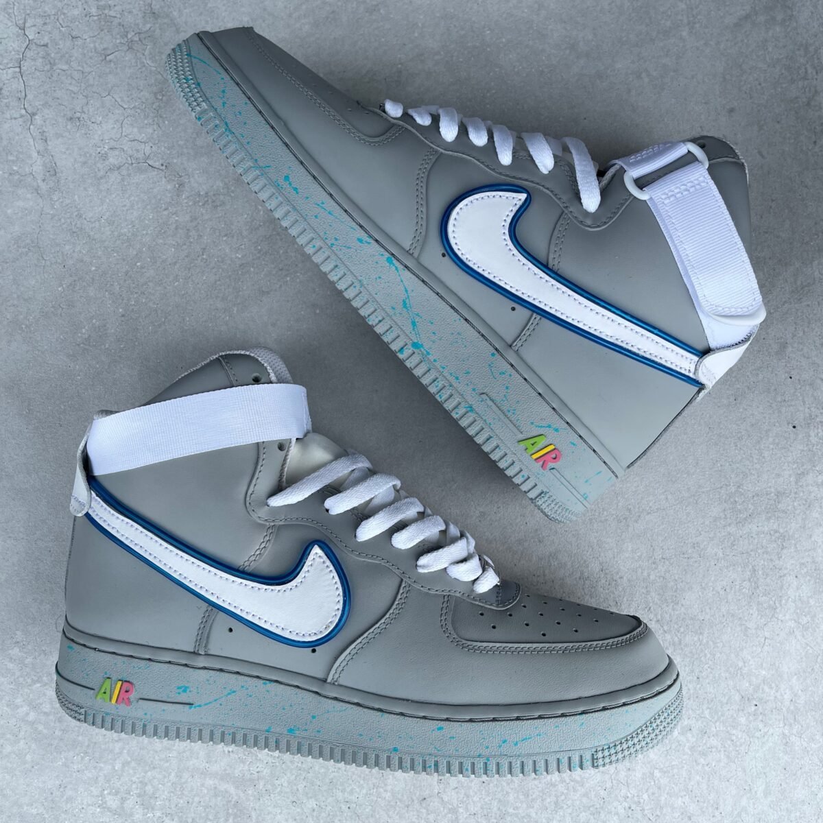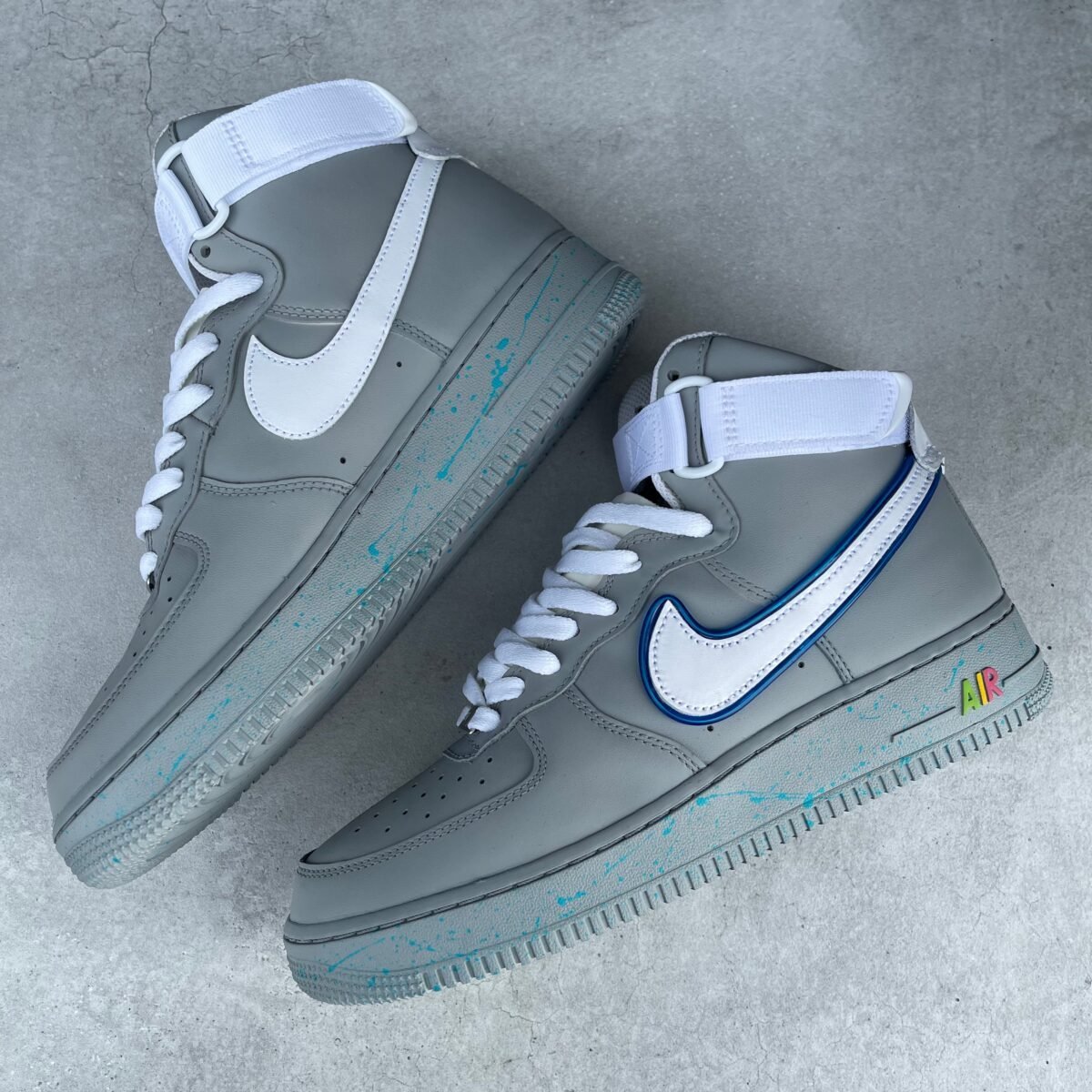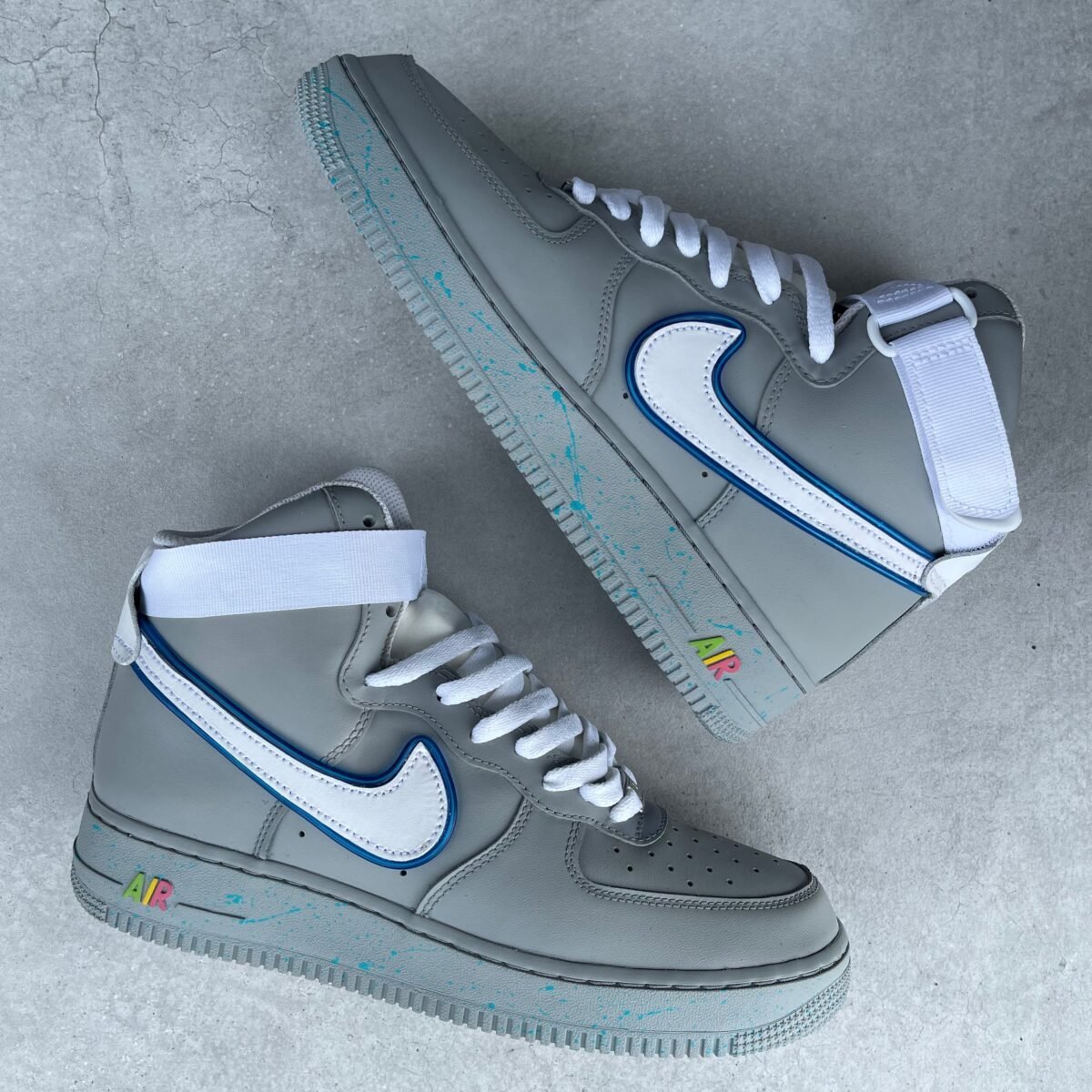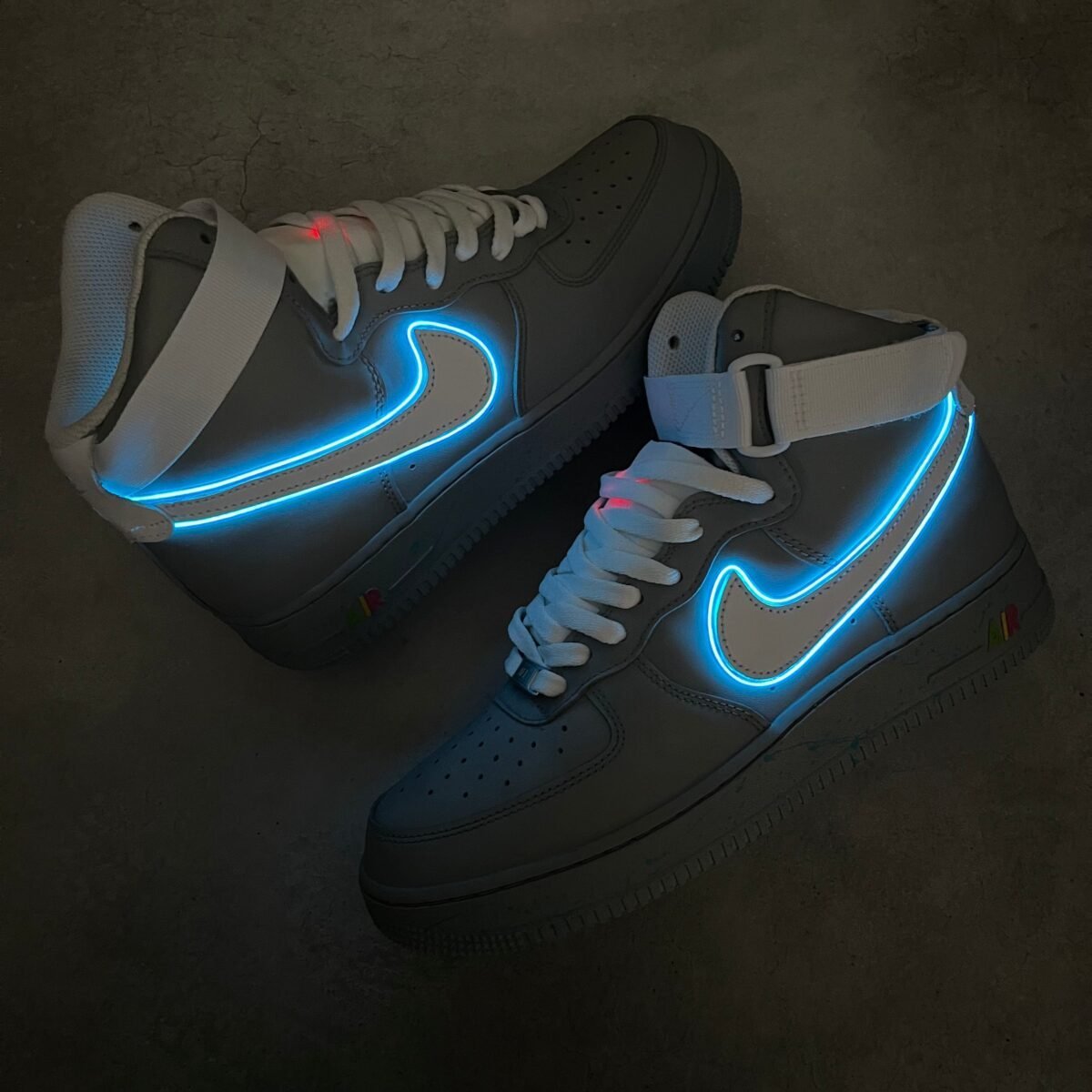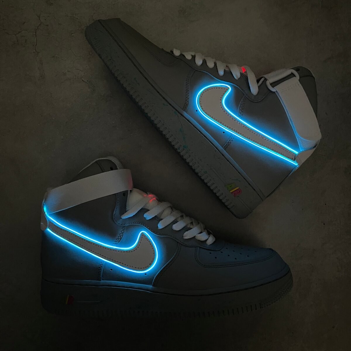 Custom AIR FORCE 1 high tops painted full grey with speckles on the soles inspired by the Air Mags. On the tongue we made an extra pocket for the led batteries. You can change the flashing of the led lights. Once the battery runs out, you can easily switch them yourself.