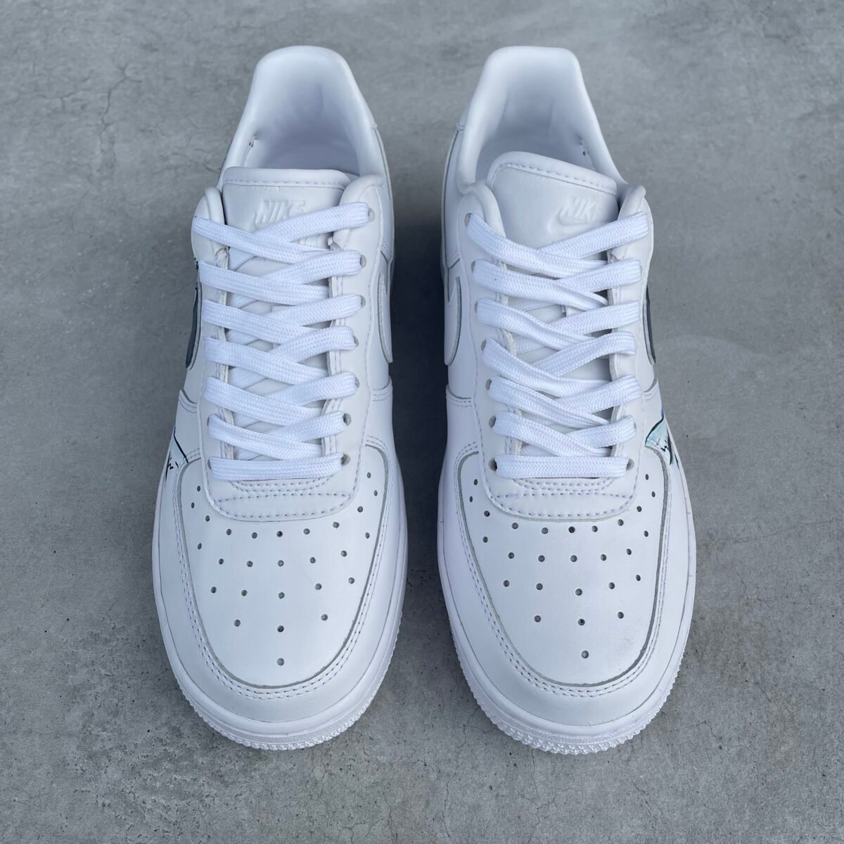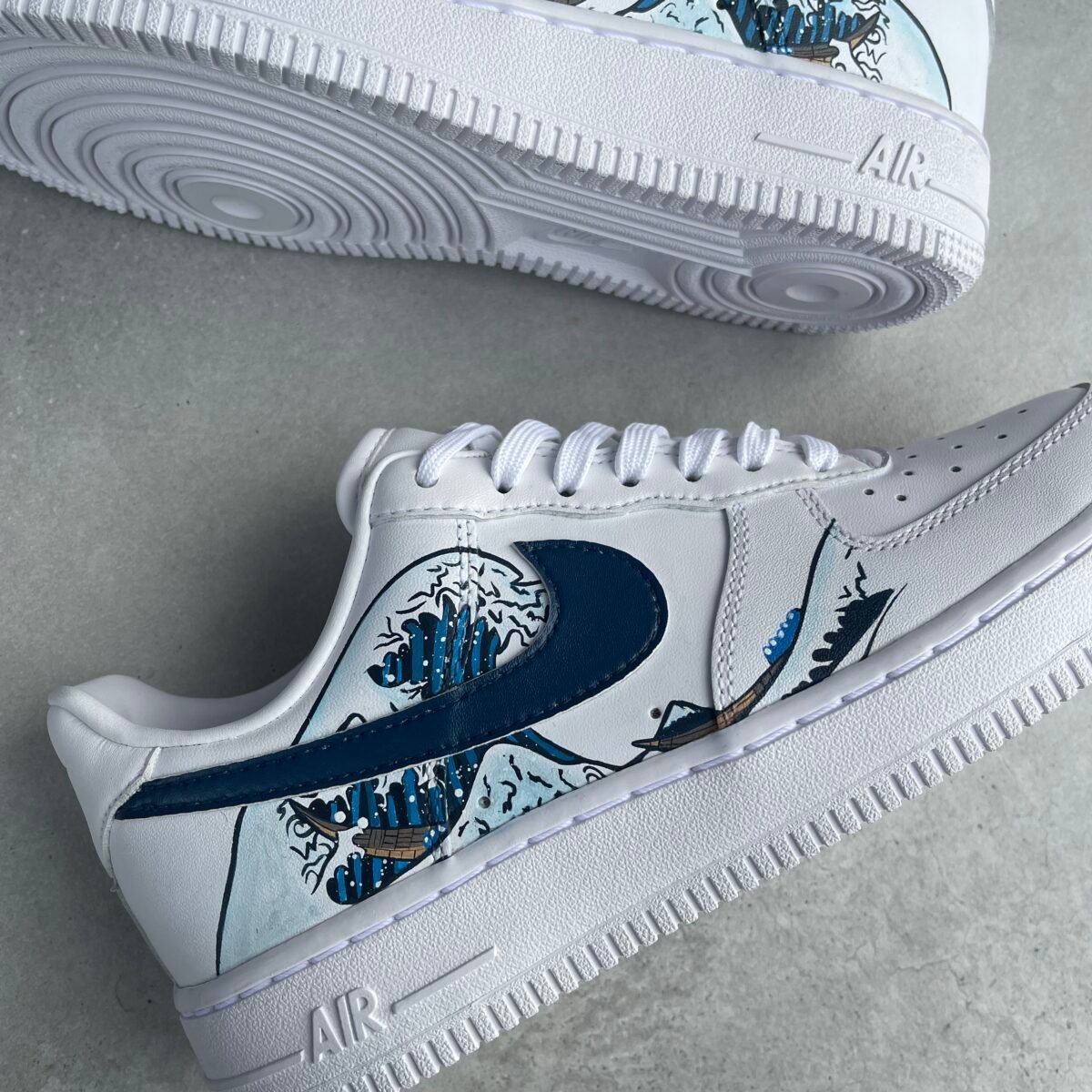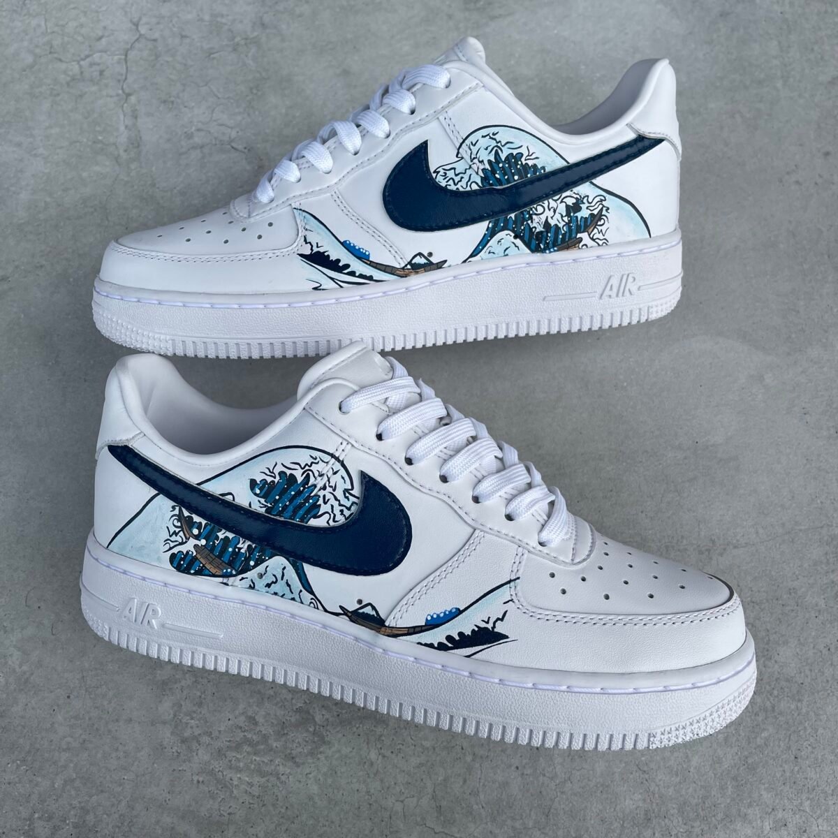 Custom AIR FORCE 1 with the Hokusai (Japanese wave) on the outside. The swooshes are painted dark blue to match.