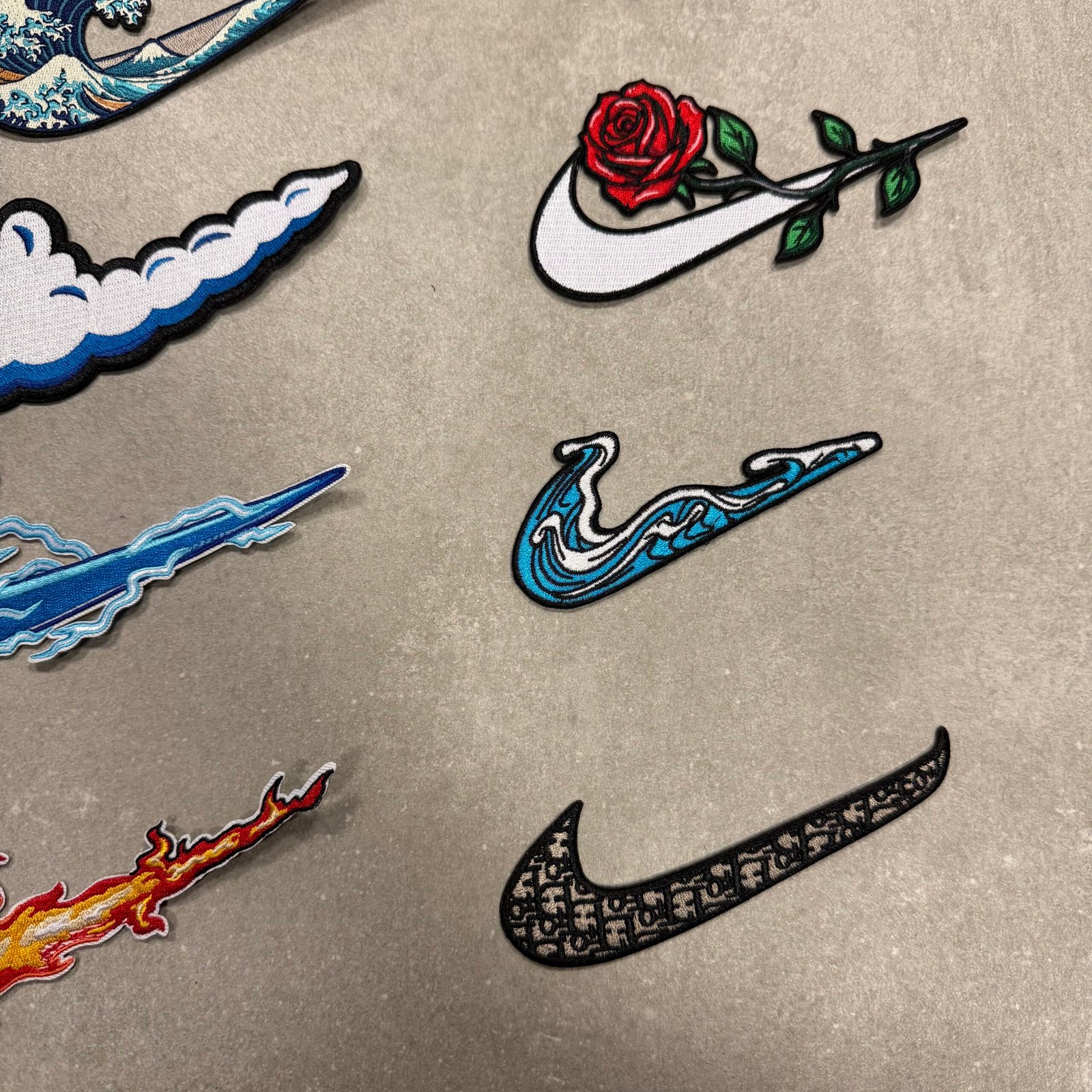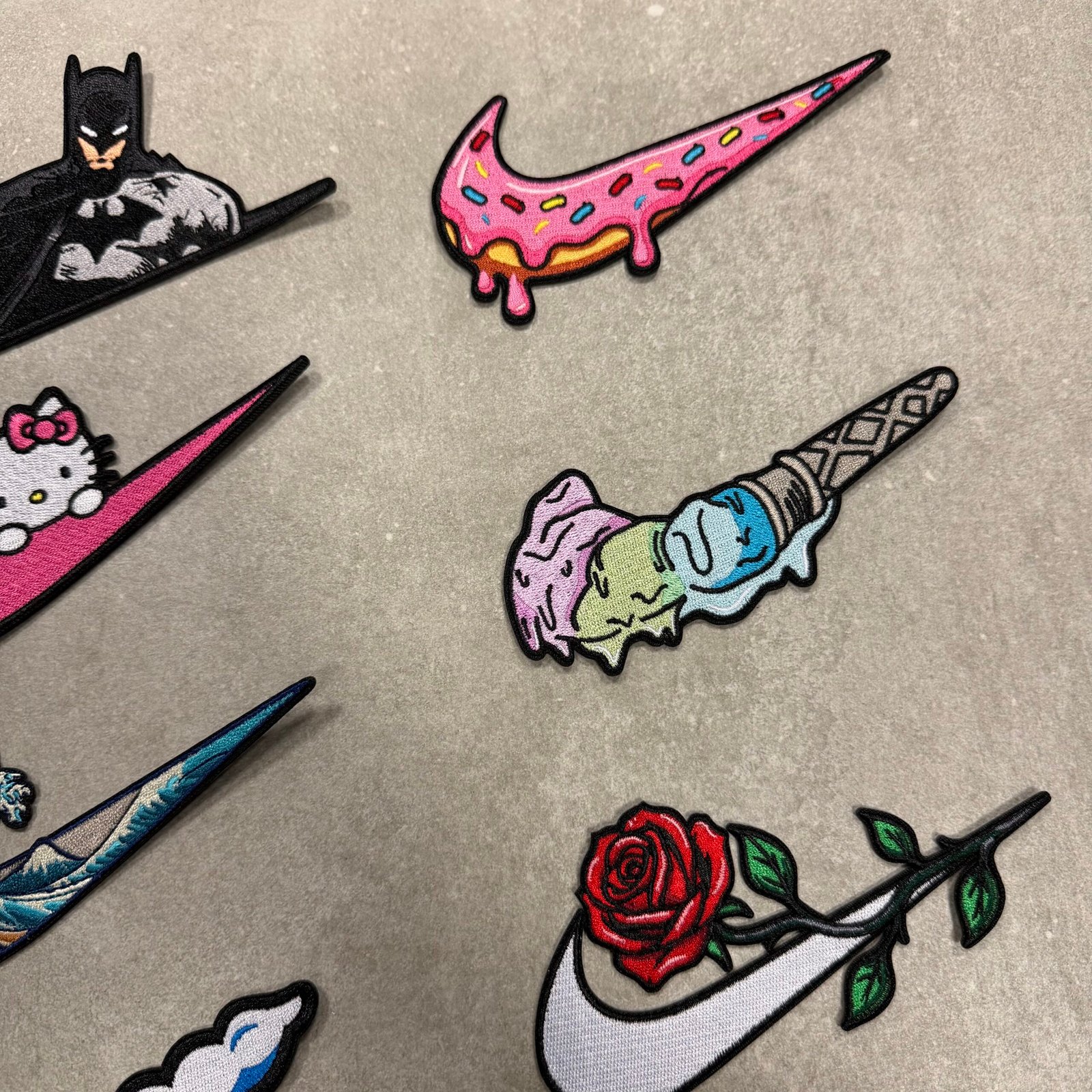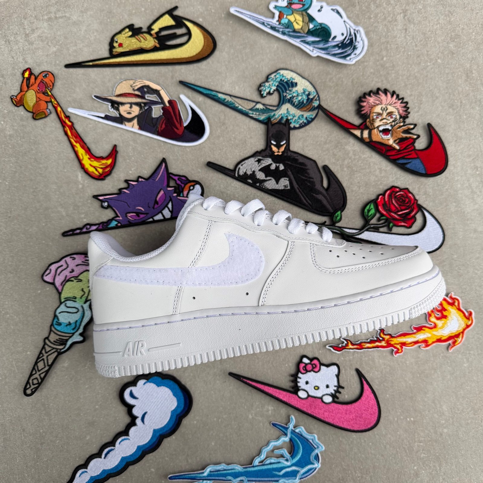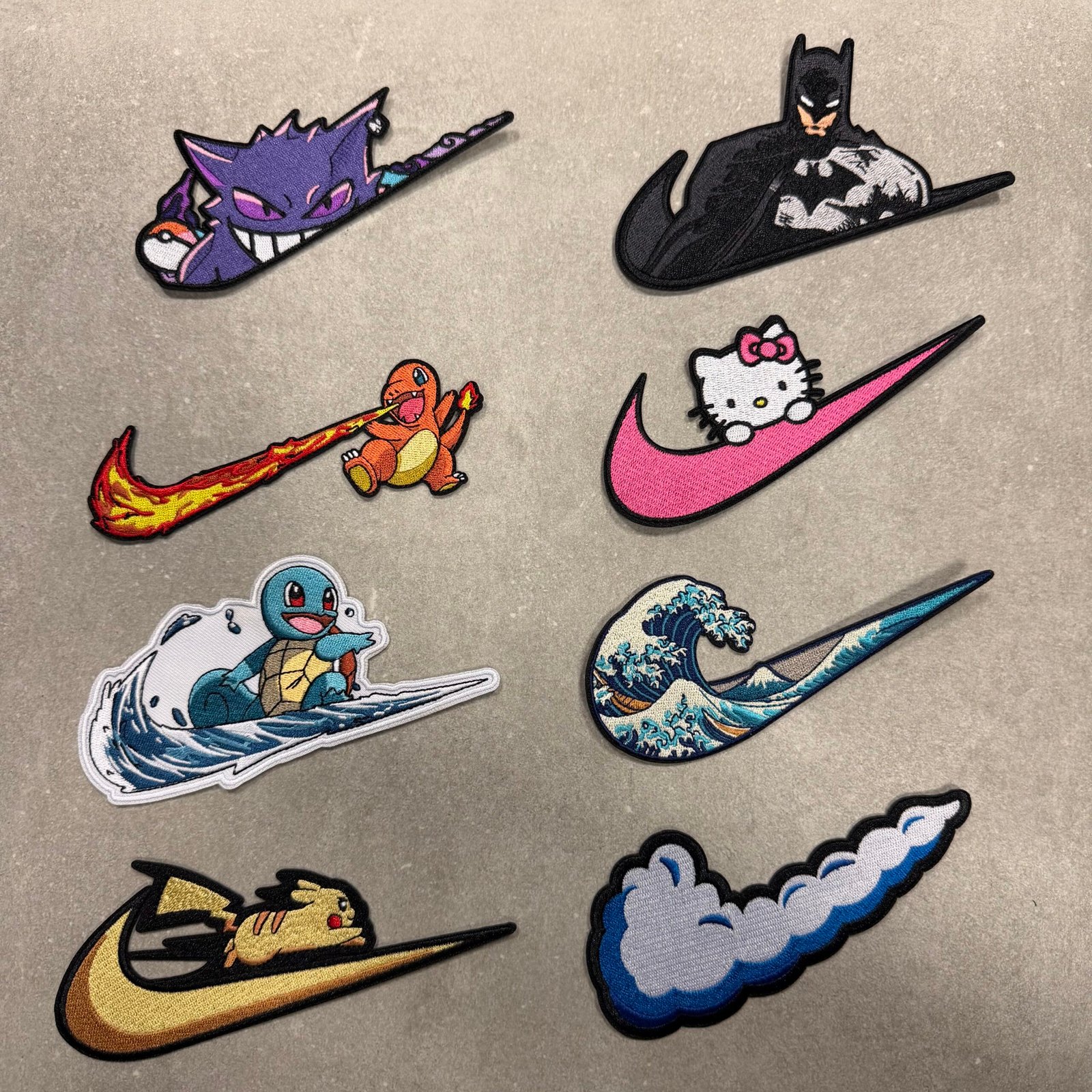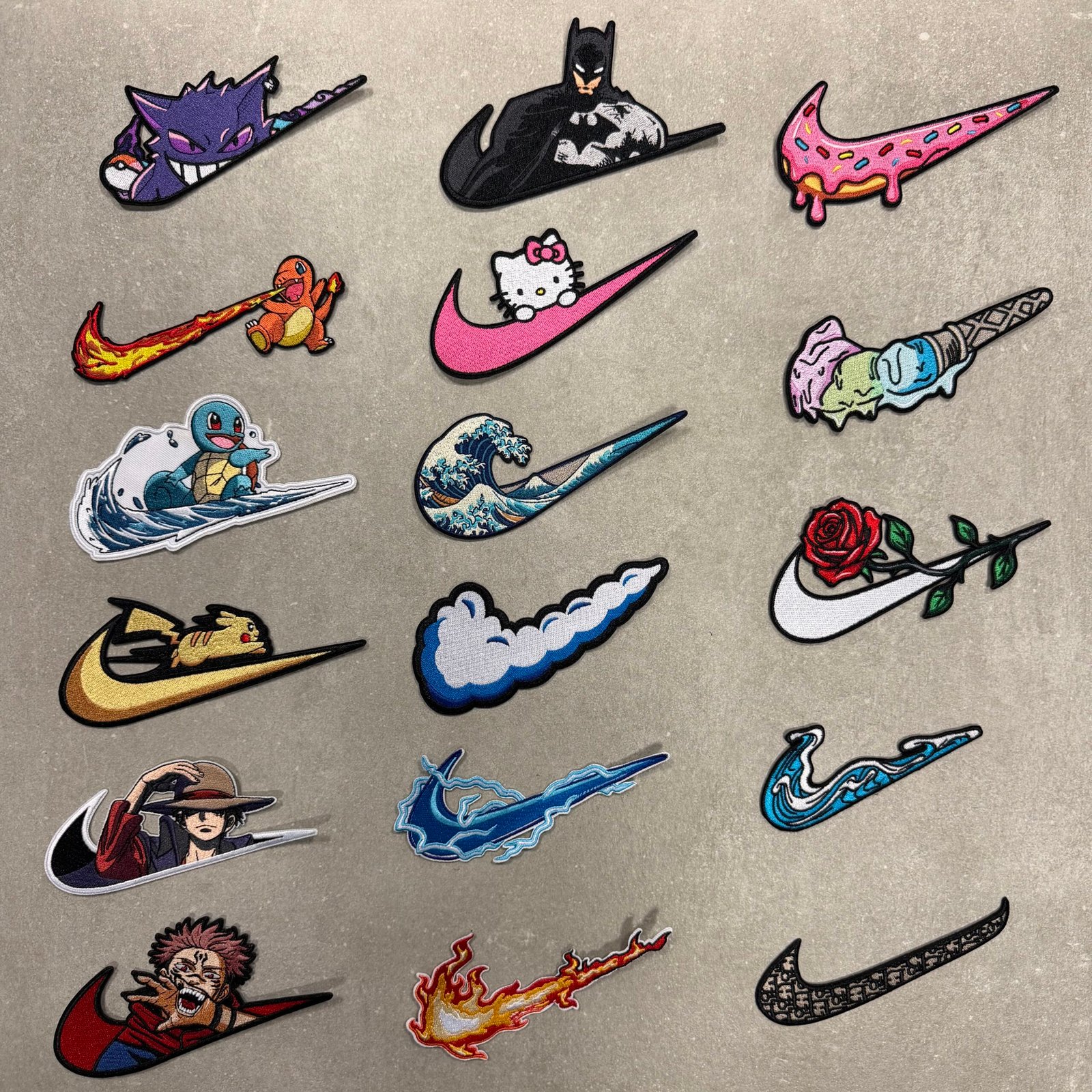 This product includes all 17 pairs of patches from the image. (Gengar, Charmander, Squirtle, Pikachu, Luffy, Sukuna, Batman, Hello Kitty, Wave, Cloud, Thunder, Flame, Donut, Ice cream, Rose, Simple wave, CD)