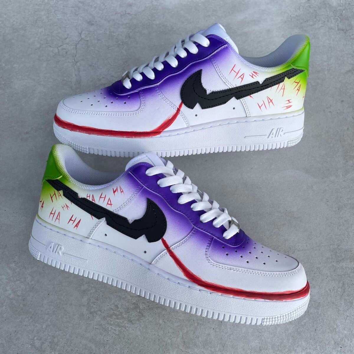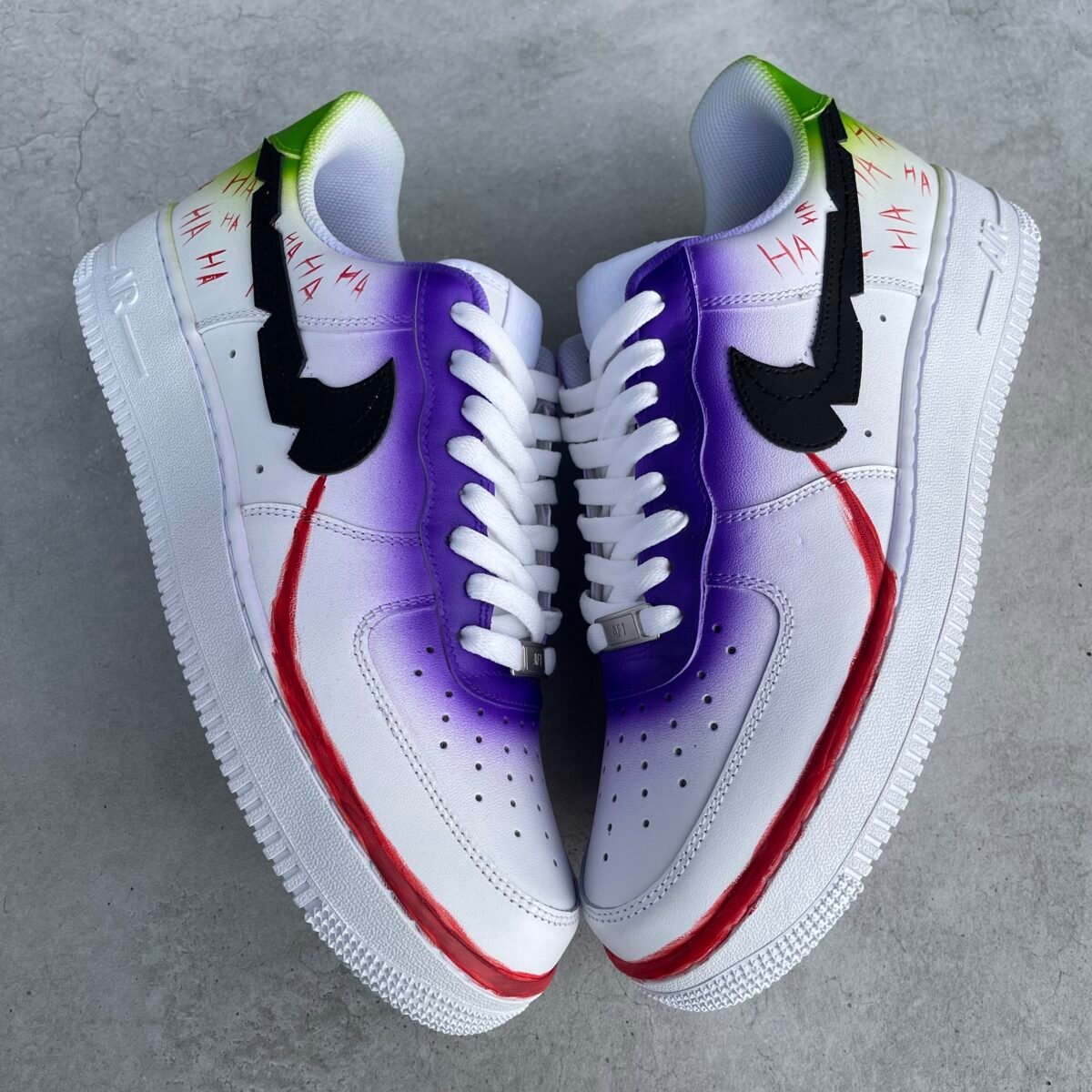 Custom AIR FORCE 1 white full painted in a Joker inspired style. Painted with the best quality paint in the game. Scratch resistant and 100% waterproof.
