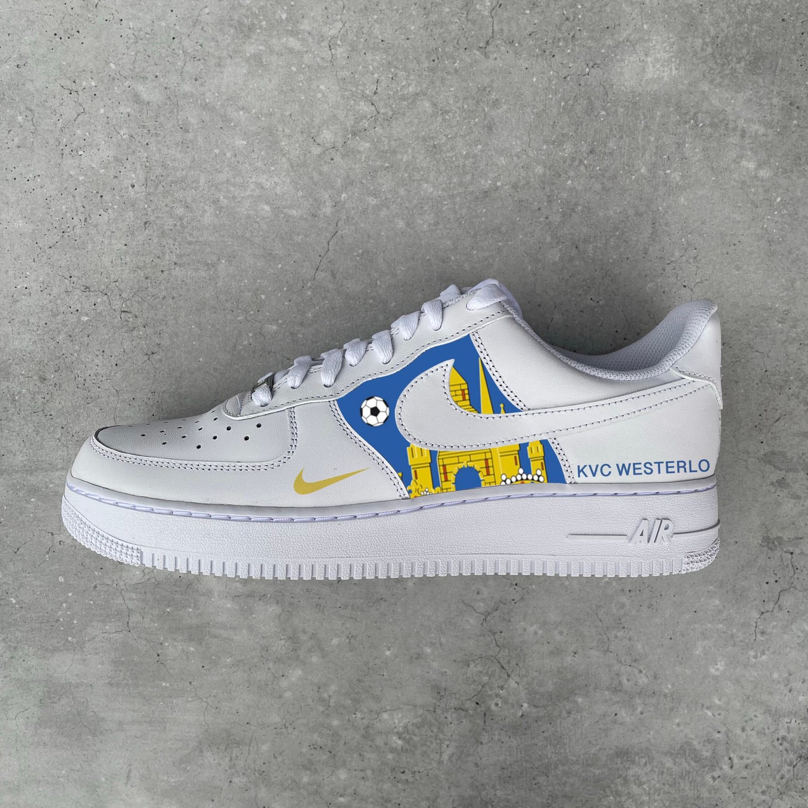 Custom AIR FORCE 1 geïnspireerd door de Belgische voetbalclub, KVC Westerlo. (Van KVC Westerlo hebben wij ook nog een ander design op de webshop.)