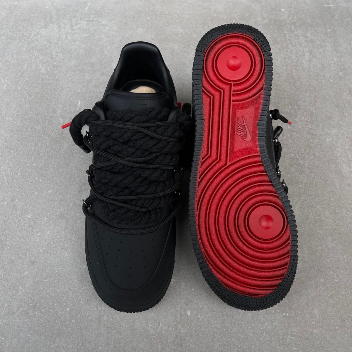 We also added black rope laces, lot laces (the smaller laces over the rope laces) & red soles