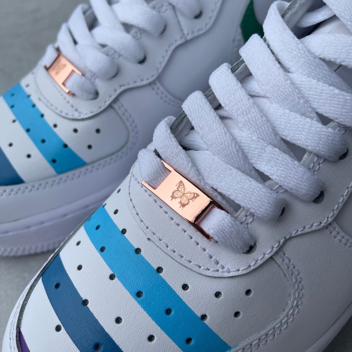 CUSTOM AIR FORCE 1 painted with rainbow logo’s and toeboxes. The swooshed on the tab and on the back are also customized in a rainbow look. Painted with the best quality paint in the game. Scratch resistant and 100% waterproof