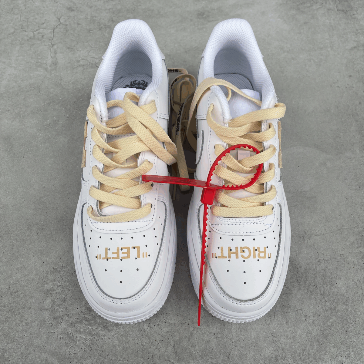 Custom AIR FORCE 1 with the OFF WHITE cross sewn on the outsides and the “AIR, “LEFT”, “RIGHT” added to the shoes . Painted with the best quality paint in the game. Scratch resistant and 100% waterproof.