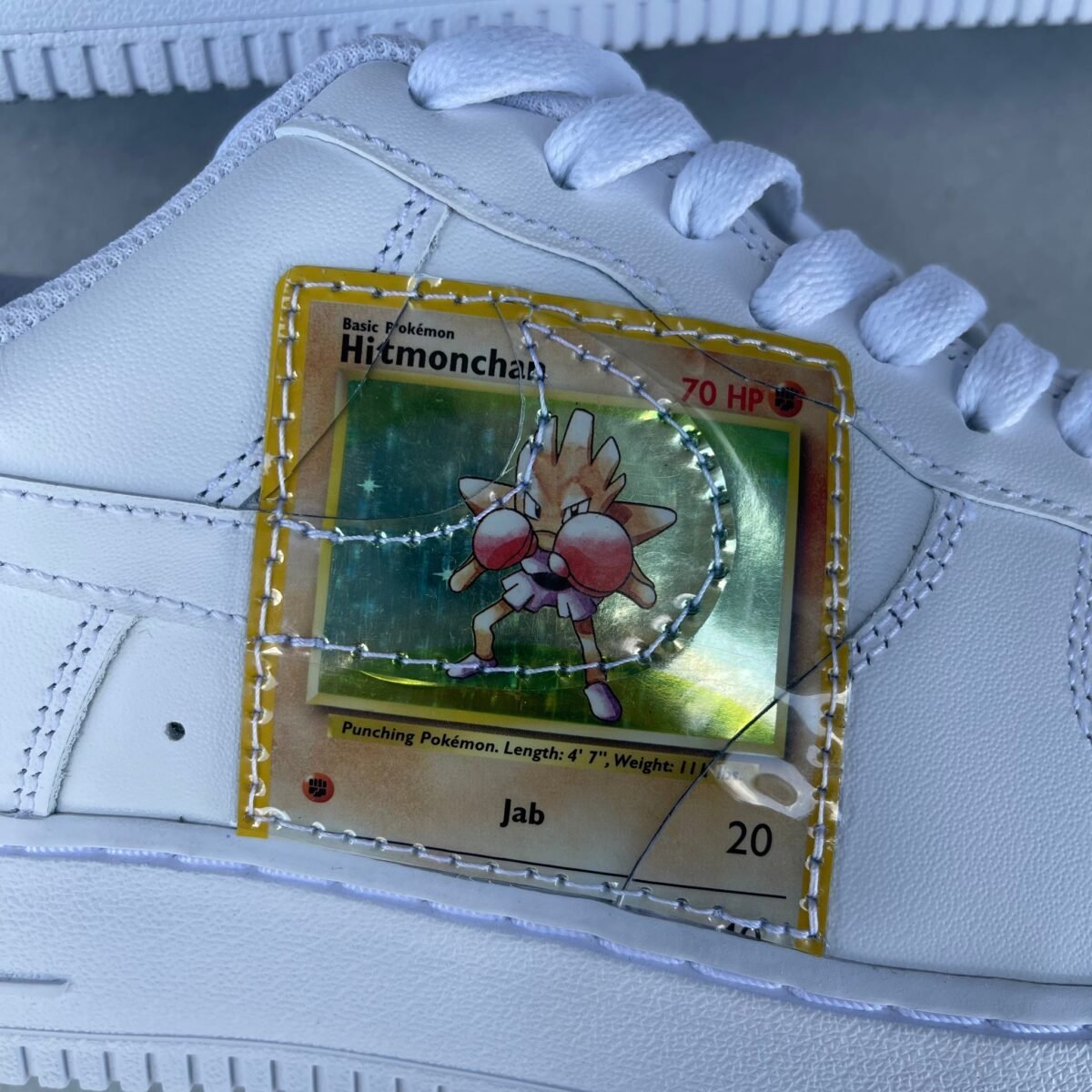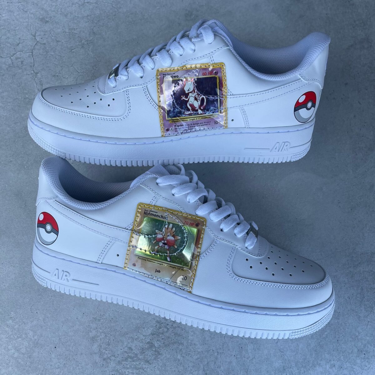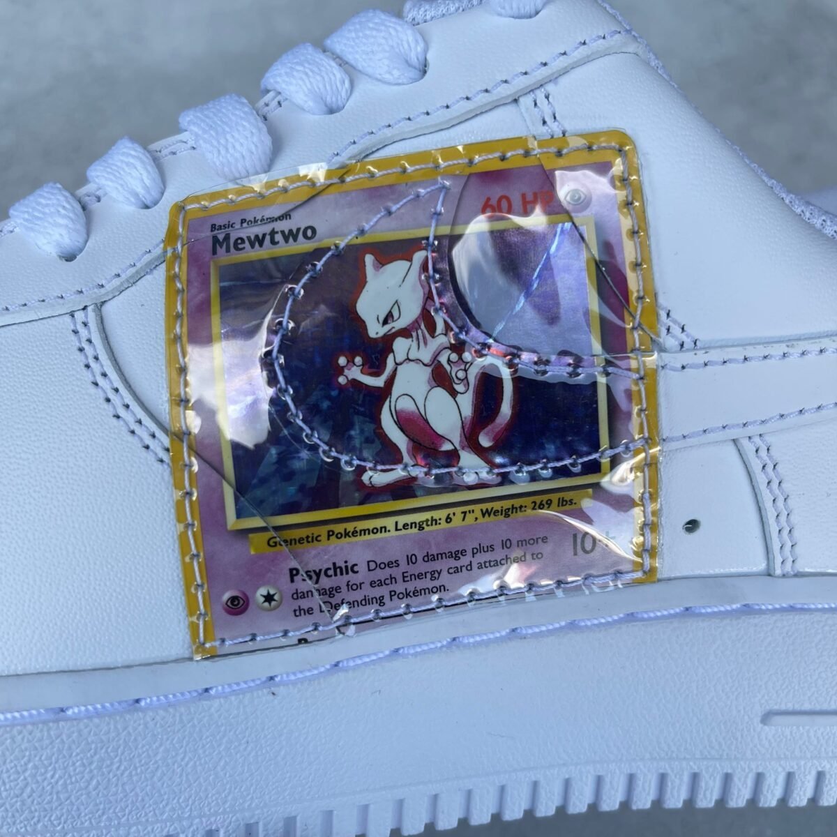 CUSTOM AIR FORCE 1 made out of two Authentic Pokémon cards. Mewtwo and Hitmonchan. A transparent layer of transparent pvc is added over the cards to protect them.