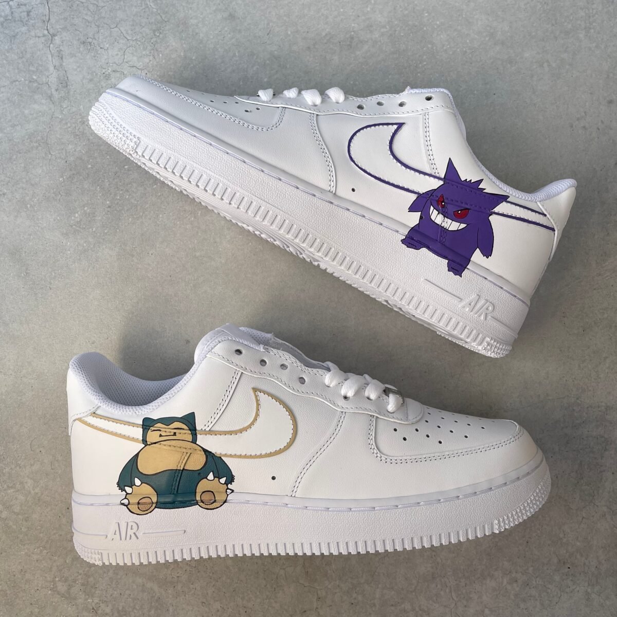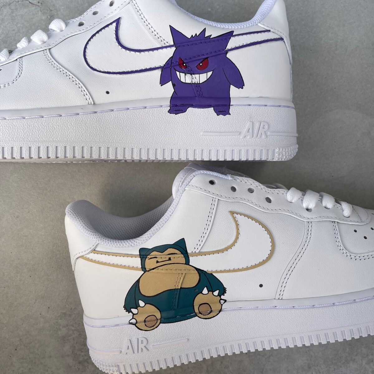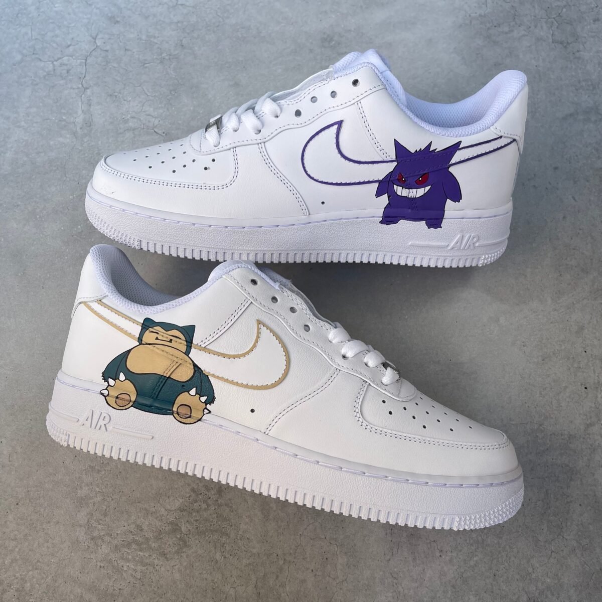 Custom AIR FORCE 1 with Snorlax and Gengar painted on the outsides. Painted with the best quality paint in the game. Scratch resistant and 100% waterproof.