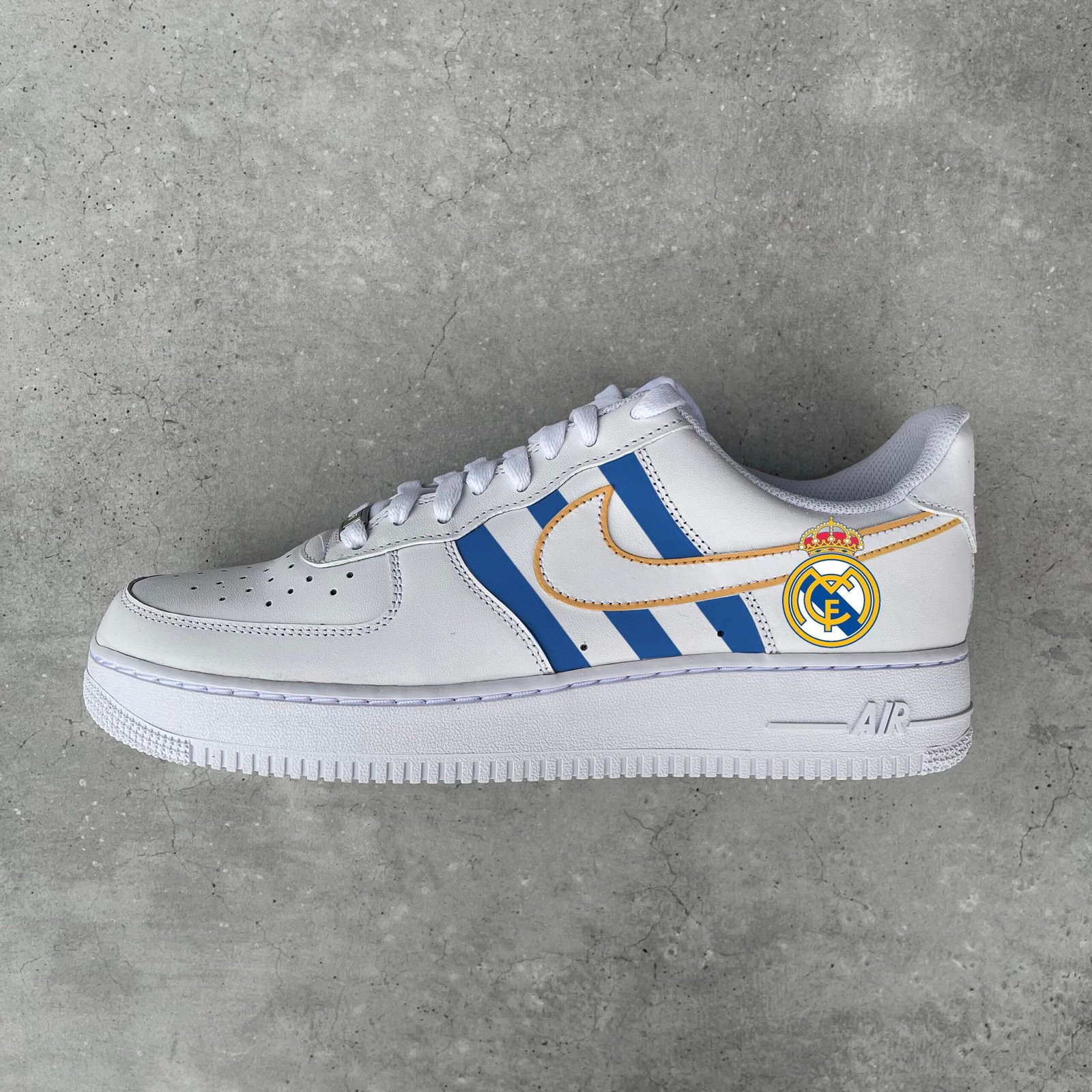 Custom Nike Air Force 1 sneakers inspired by the style of the Spanish club Real Madrid.