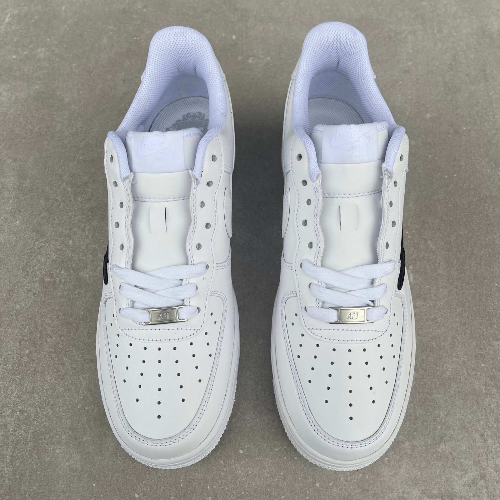 Custom AIR FORCE 1 white with a reverse black swoosh added. The reverse swoosh is glued and sewn on.
