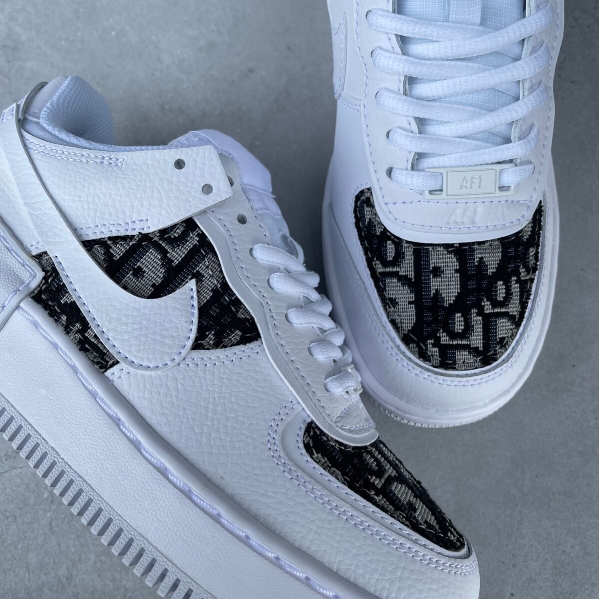 CUSTOM AIR FORCE 1 shadow with Christian D classic fabric on the toe box and behind the swoosh. The fabric is glued and sewn on