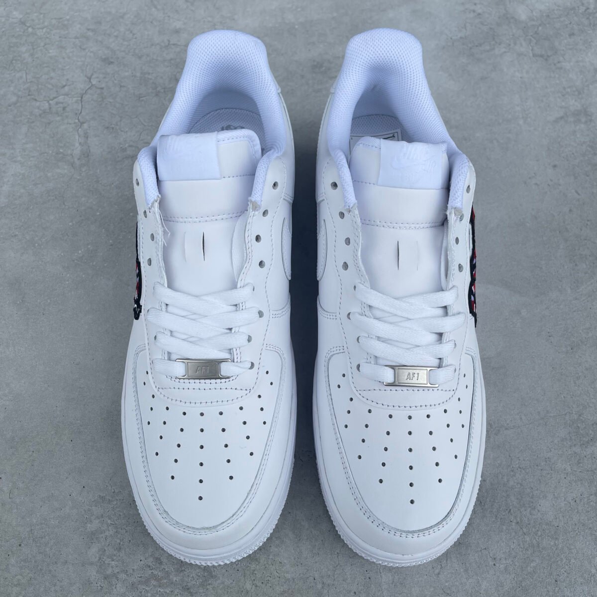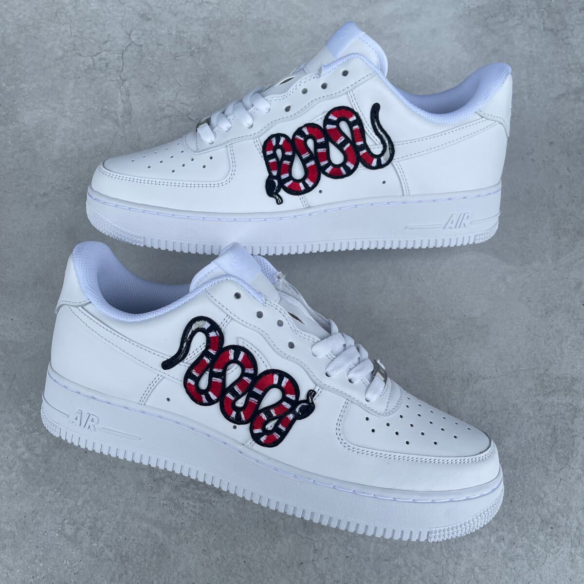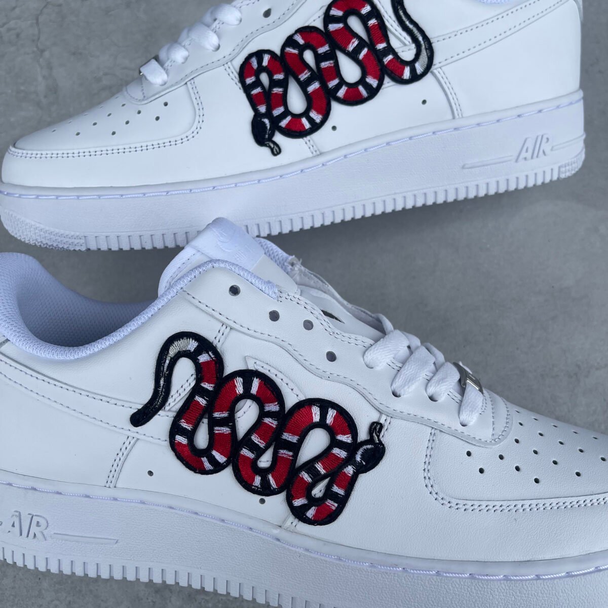 CUSTOM AIR FORCE 1 with a snake patch glued and sewn on the outsides.