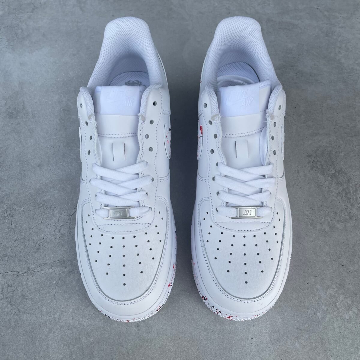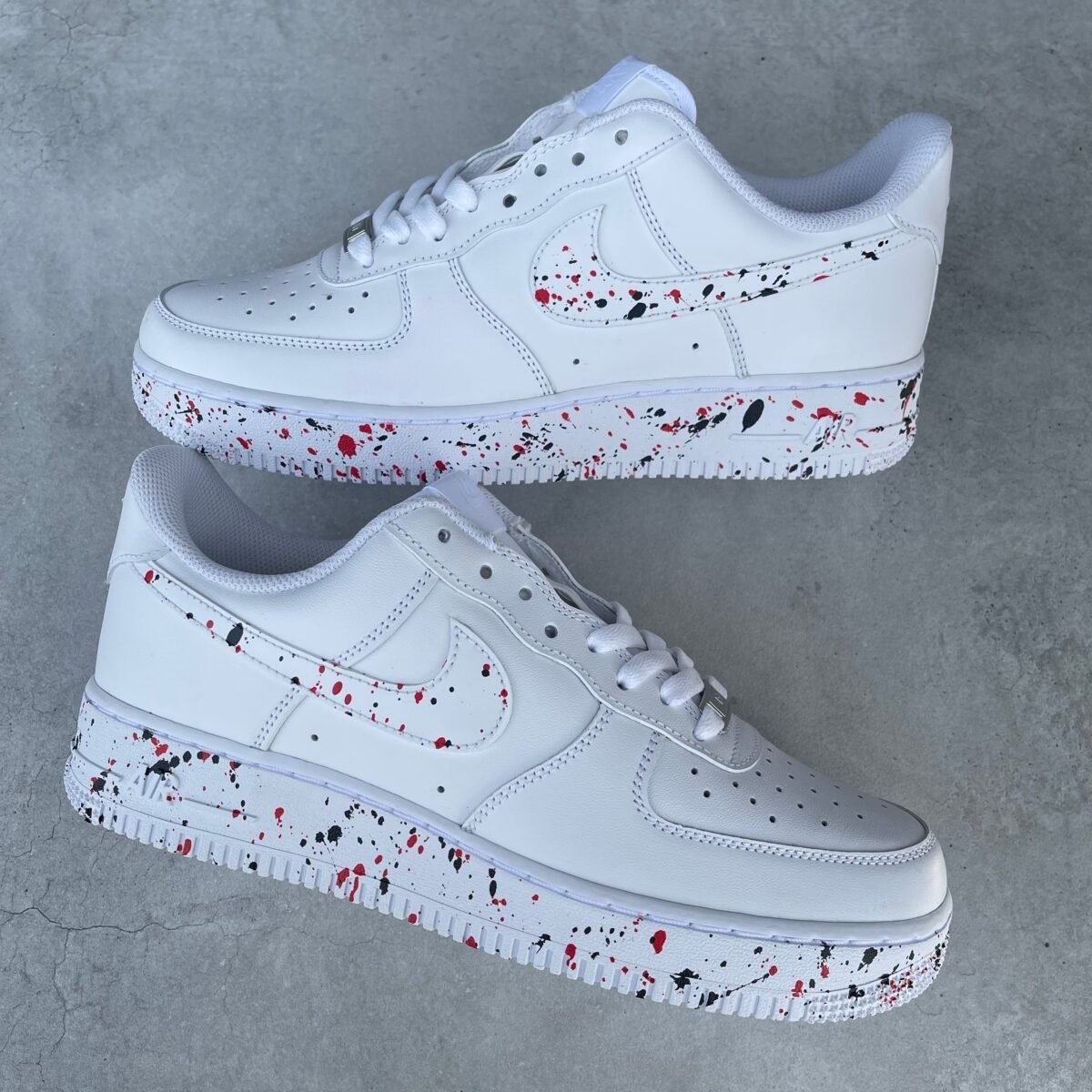 CUSTOM AIR FORCE 1 with red and black splash on the swooshes and soles. Painted with the best quality paint in the game. Scratch resistant and 100% waterproof.