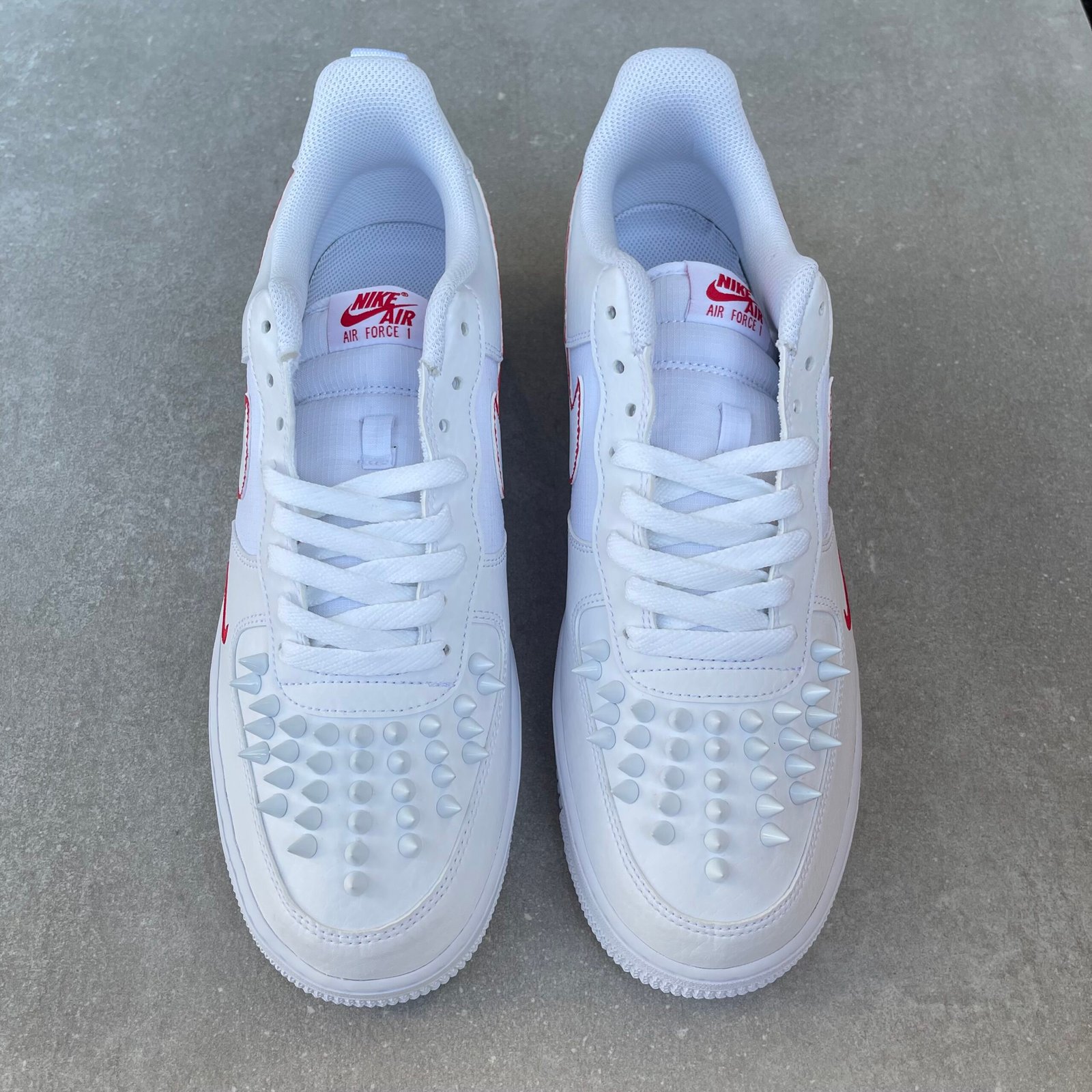 Custom AIR FORCE 1 with white metal spikes screwed on the shoes. Special screws are used so you won’t feel anything while wearing these shoes. The bottoms are painted in red with sole protectors over it, so the red won’t go off.