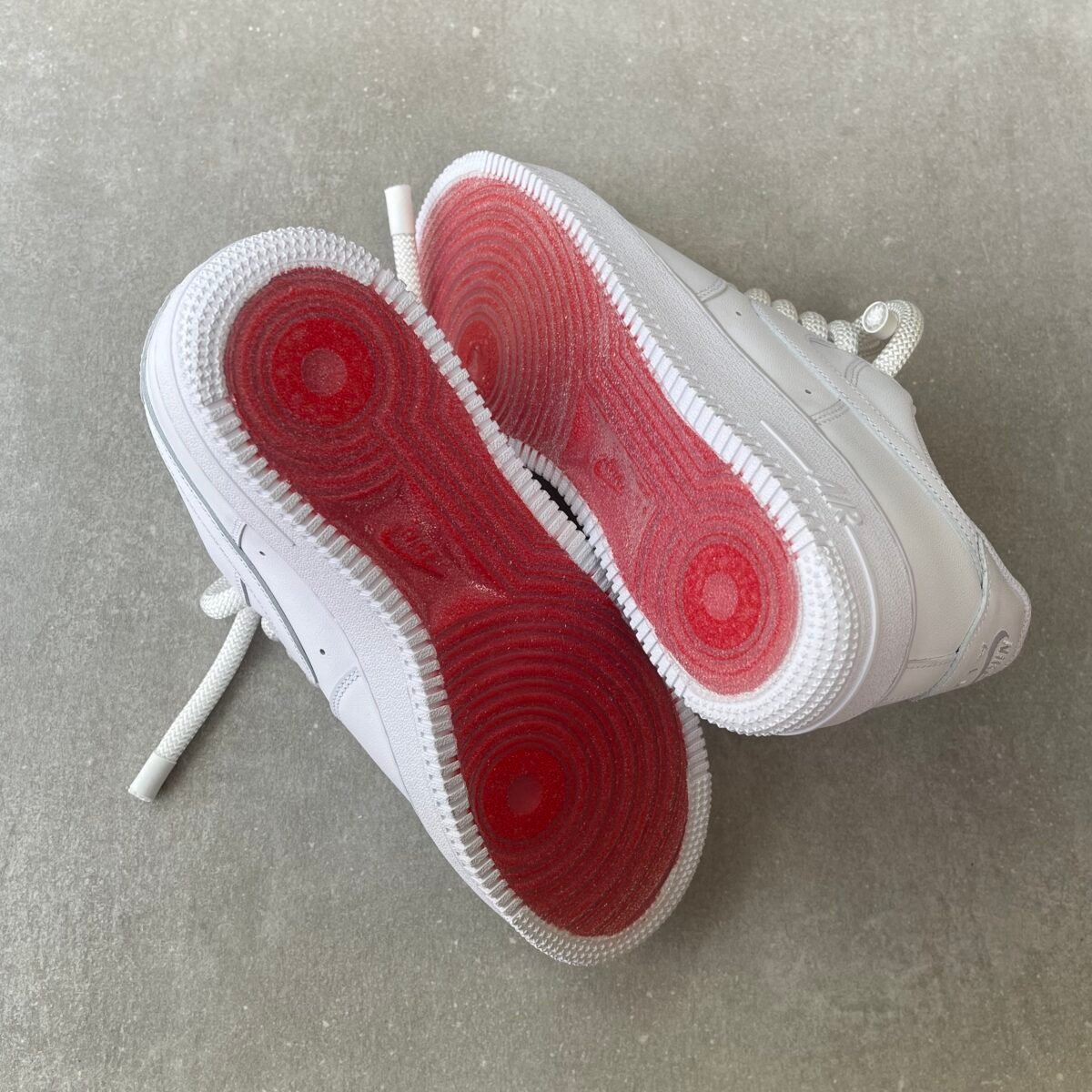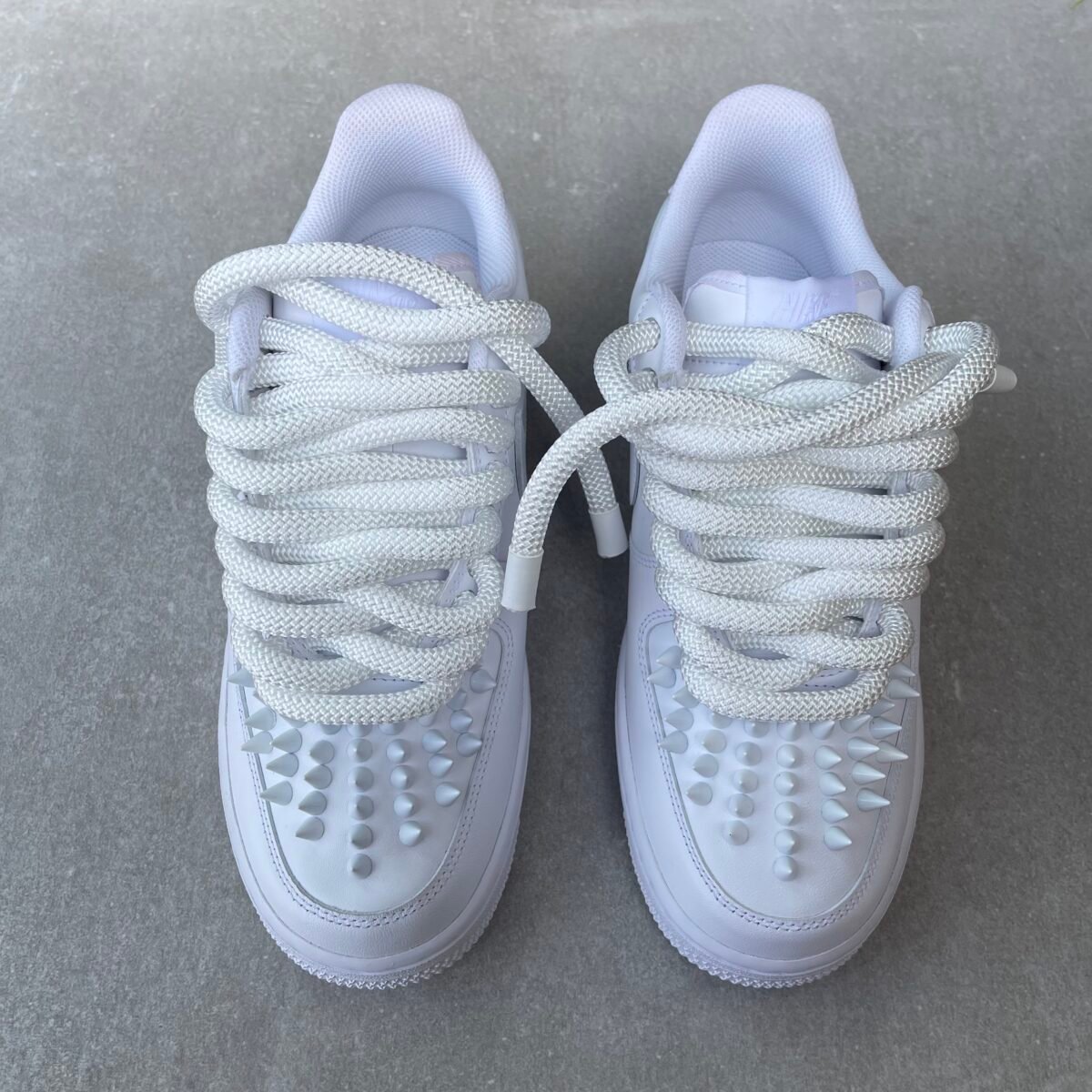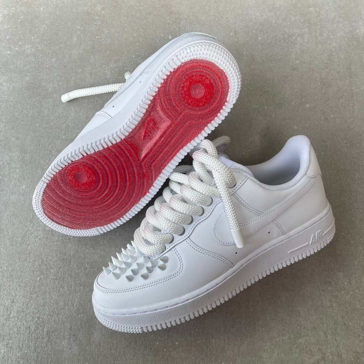 Custom AIR FORCE 1 with white metal spikes screwed on the shoes. Special screws are used so you won’t feel anything while wearing these shoes. The bottoms are painted in red with sole protectors over it, so the red won’t go off. We have also added rope laces 2.0 on these. (They are also available with normal laces)