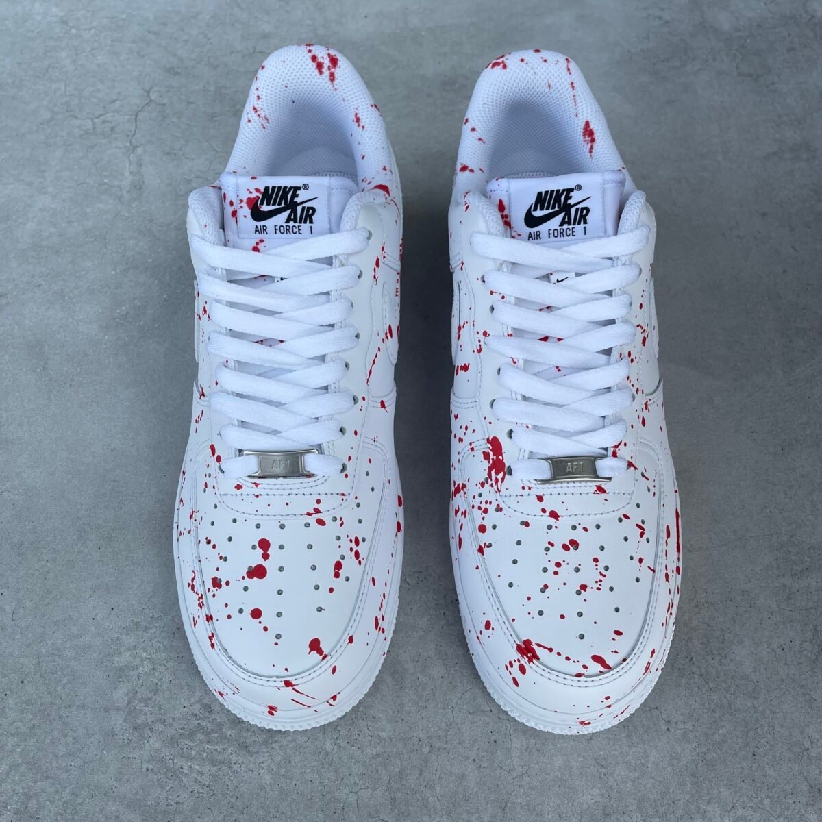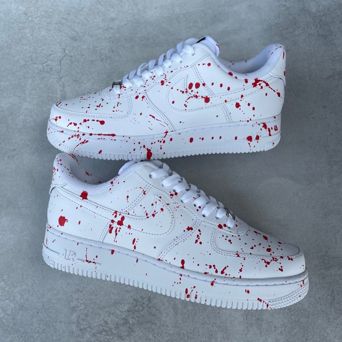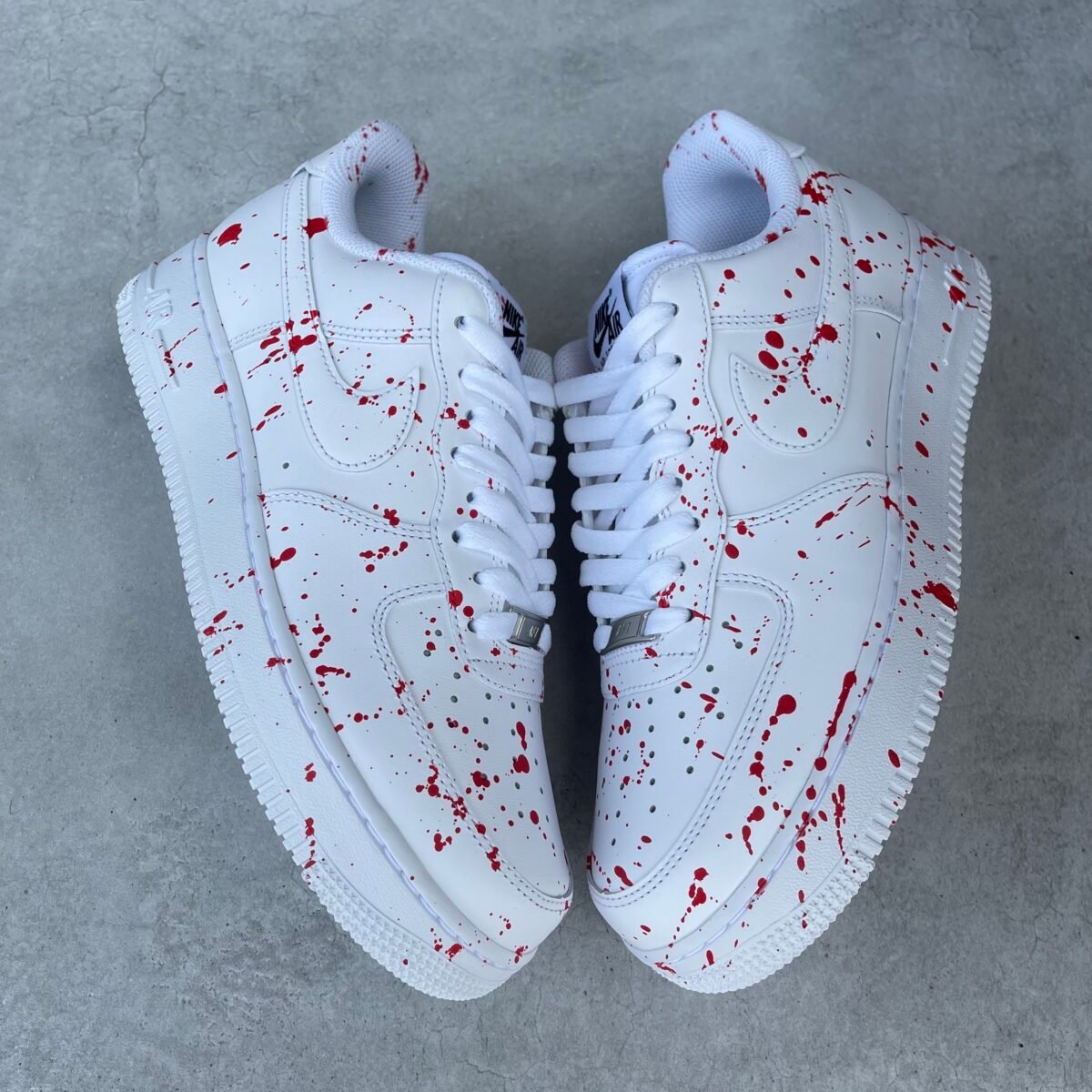 CUSTOM AIR FORCE 1 with red splash all over except for the swoosh. Painted with the best quality paint in the game. Scratch resistant and 100% waterproof