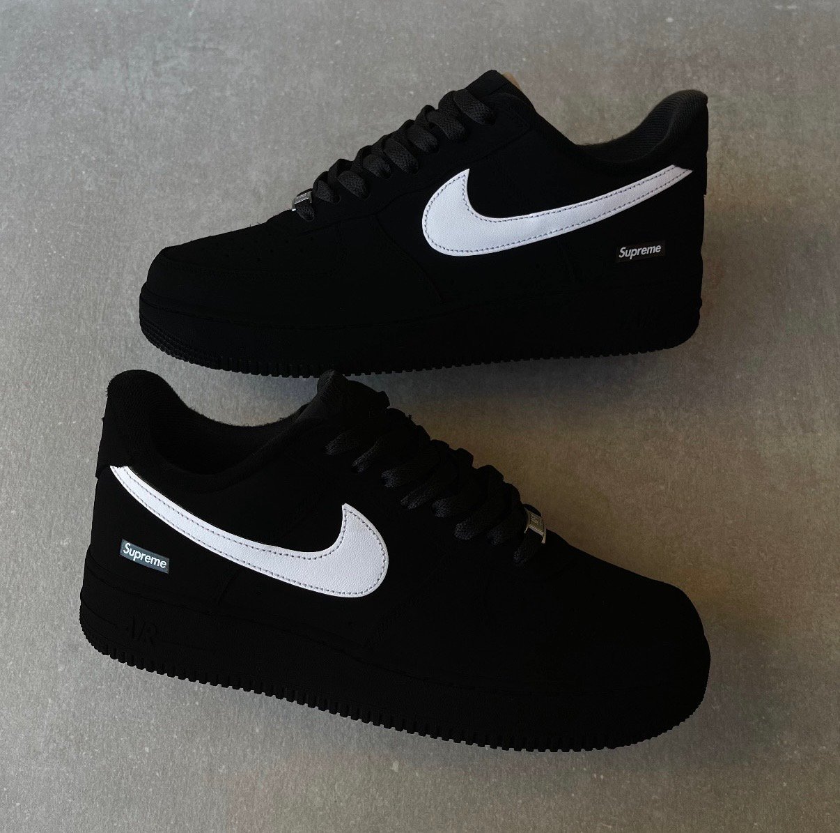 Custom AIR FORCE 1 Supreme – Blackest / White swooshes (EU 43 / US 9.5)