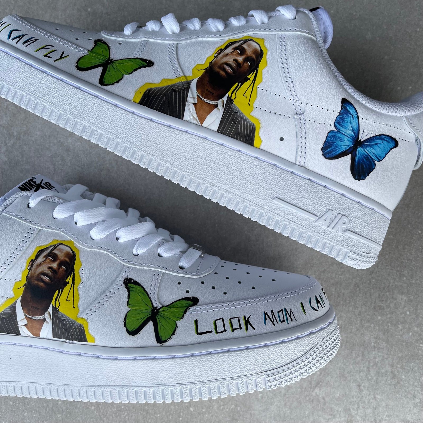 Custom AIR FORCE 1 inspired by Travis Scott. Painted with the best quality paint in the game. Scratch resistant and 100% waterproof. For the butterfly’s and Travis image we used the best quality heat transfers.