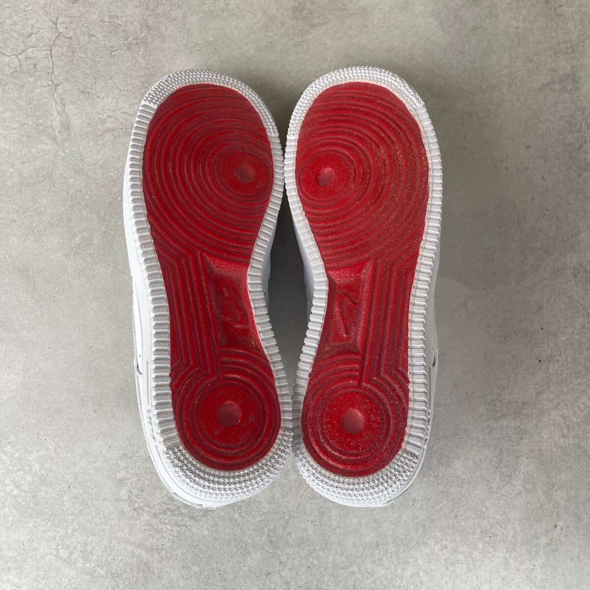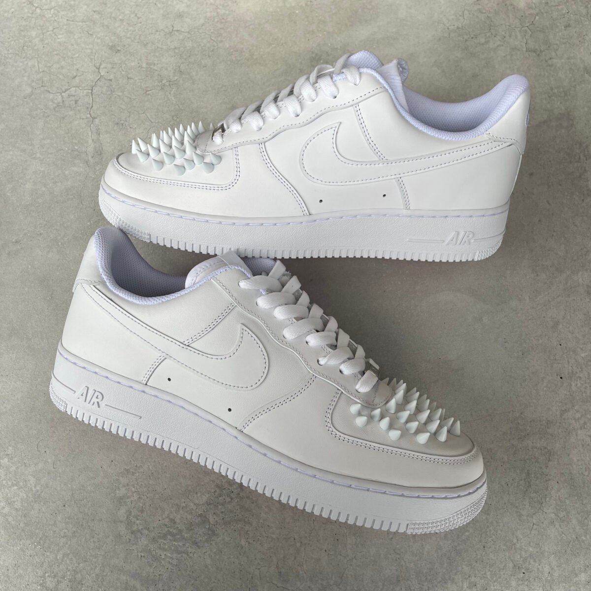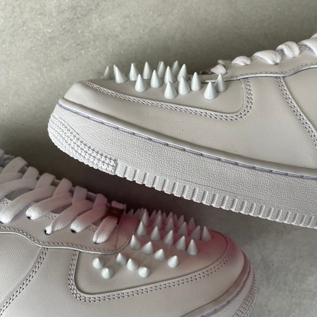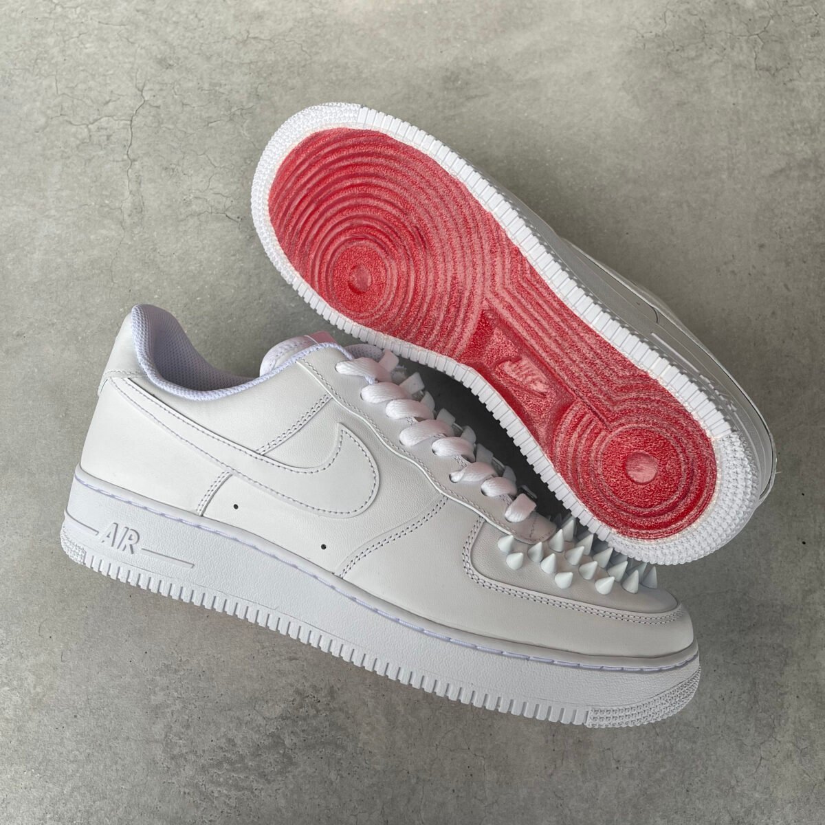 Custom AIR FORCE 1 with white metal spikes screwed on the shoes. Special screws are used so you won’t feel anything while wearing these shoes. The bottoms are painted in red with sole protectors over it, so the red won’t go off.
