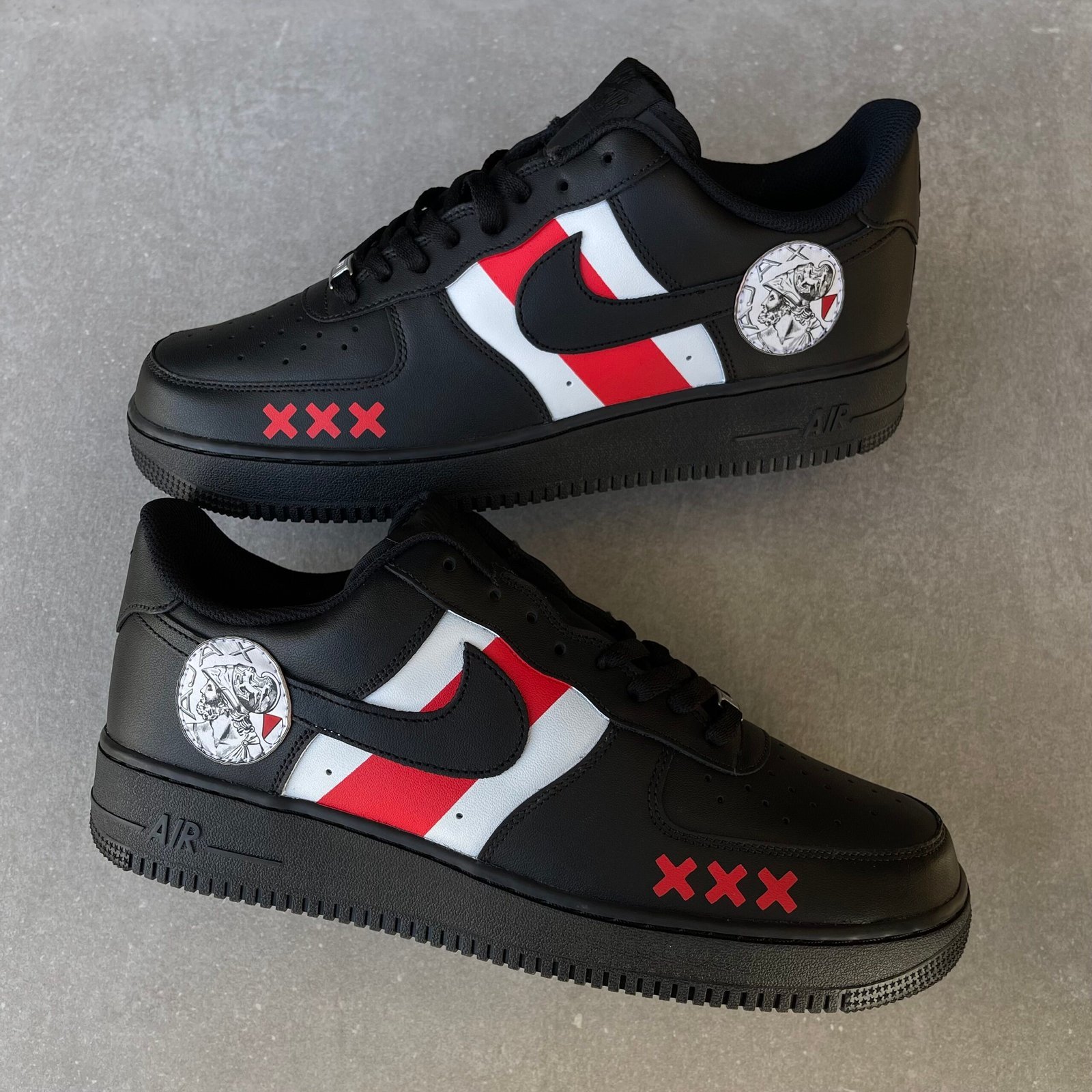 Custom AIR FORCE 1 volledig gecustomized in de style van de voetbalclub Ajax Amsterdam met het oude klassieke logo! Deze zijn ook beschikbaar in het wit. (Ook beschikbaar met het nieuwe logo)