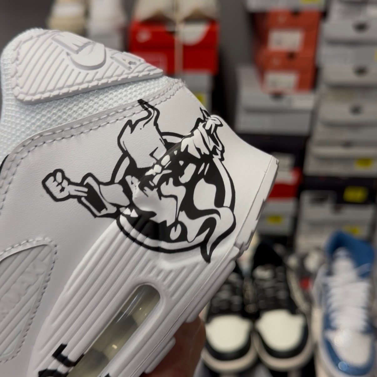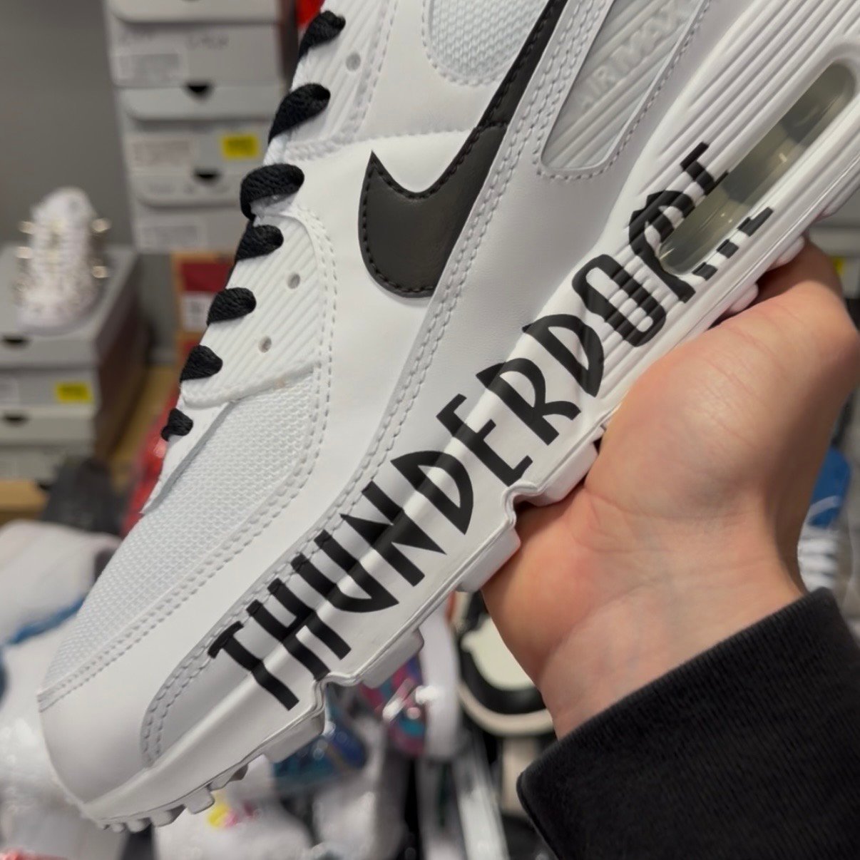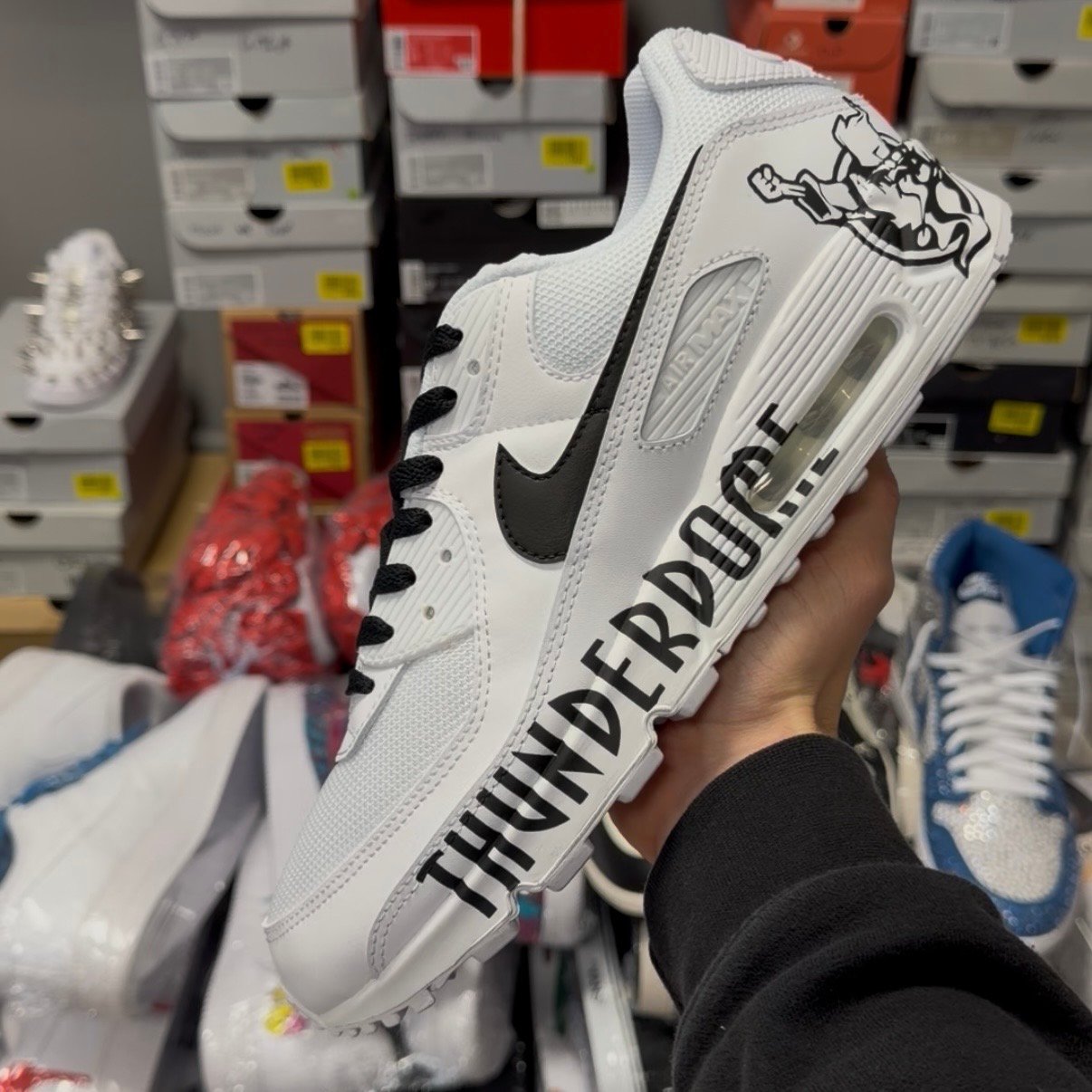 Custom Nike Air Max 90 in a Thunderdome theme. With the “Thunderdome” text logo and the well known Thunderdome animation logo on the back. We have also added black laces and made the Nike logo black.