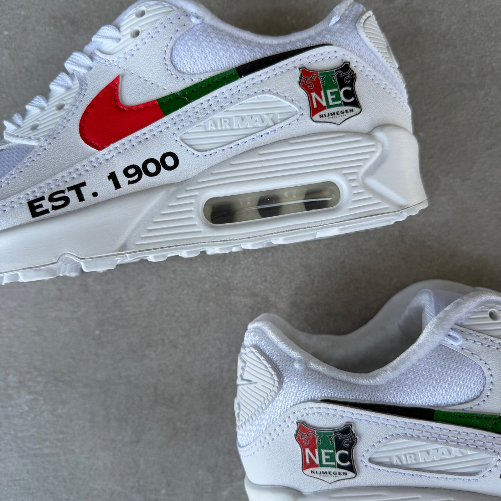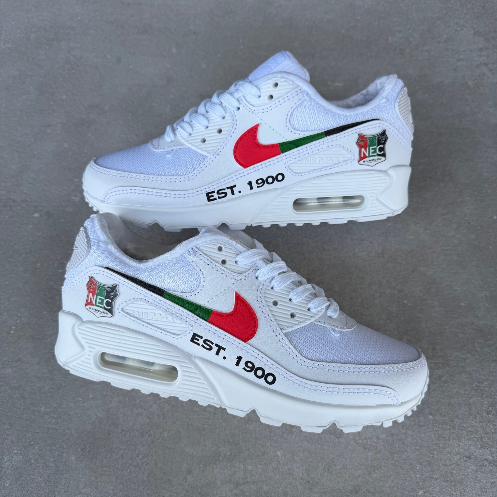 Custom Air Max 90 geïnspireerd door de Nederlandse voetbalclub, “N E C”.