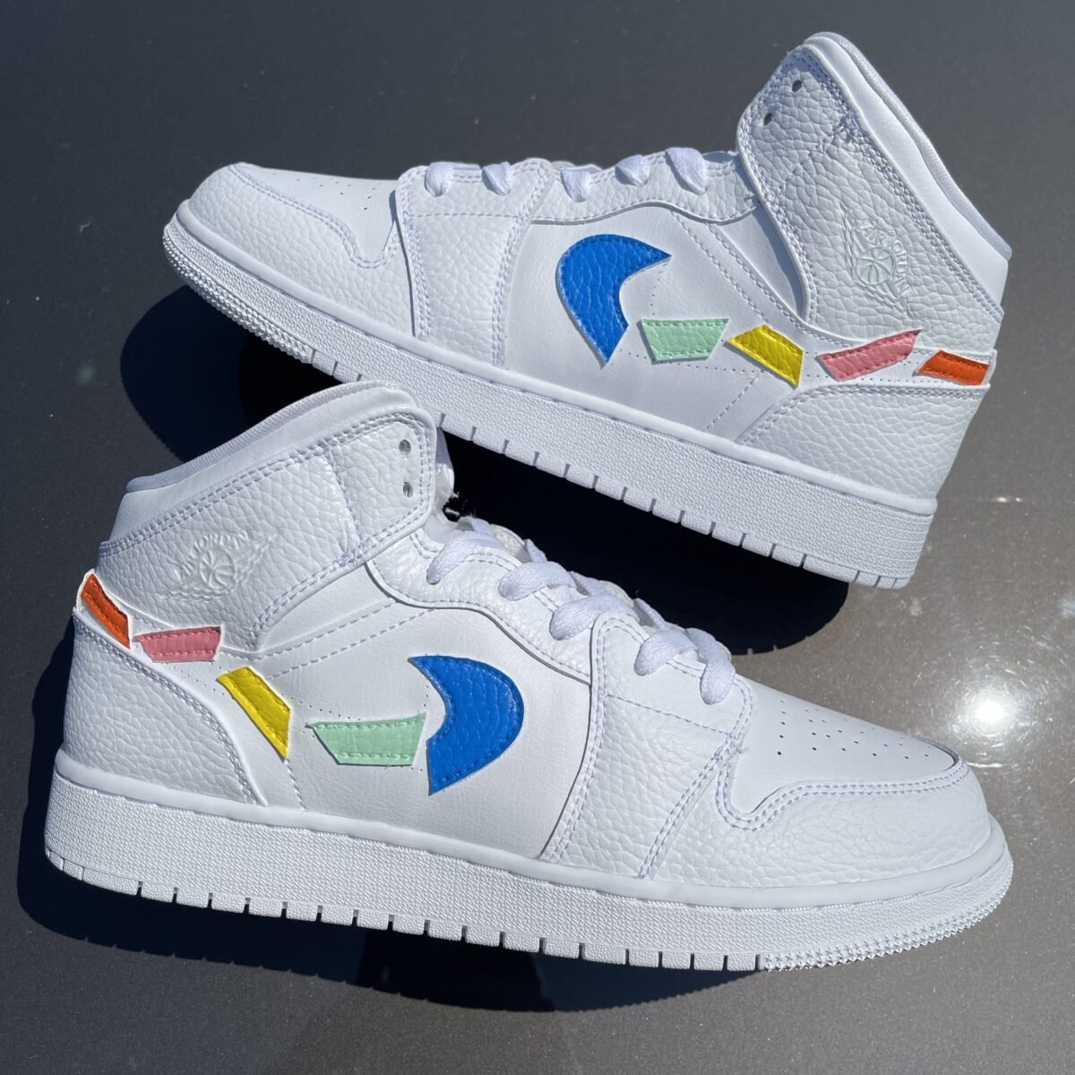 Custom JORDAN 1 destroyed swooshes in turquoise, blue, mint, yellow, pink and orange. The swoosh is removed, cut out in pieces and sewn back on.
